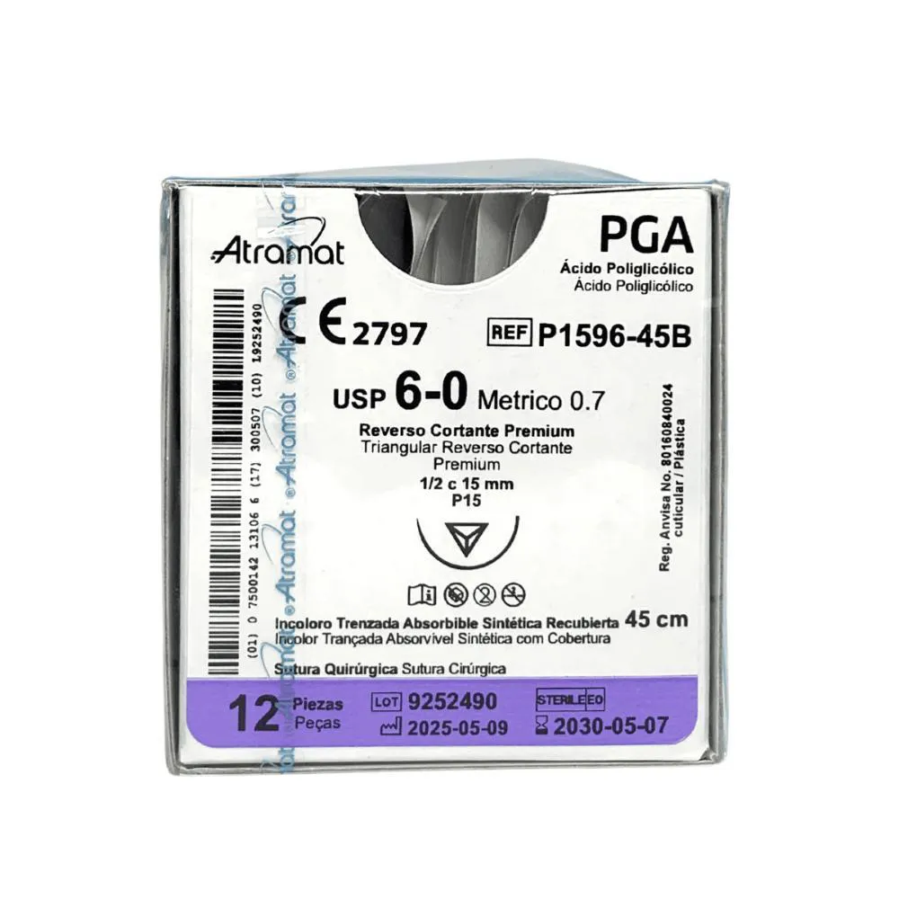 O Fio de Sutura Ácido Poliglicólico Incolor 6-0 - P1596-45B da Atramat é um fio sintético absorvível de alta qualidade, desenvolvido para suturas precisas e seguras em tecidos moles. Produzido com ácido poliglicólico (PGA), oferece excelente resistência à tração, manuseio suave e absorção previsível pelo organismo. Equivalente ao Vicryl J105G, é amplamente utilizado em cirurgias plásticas, oftalmológicas, odontológicas e microcirurgias que exigem precisão e resultados estéticos.