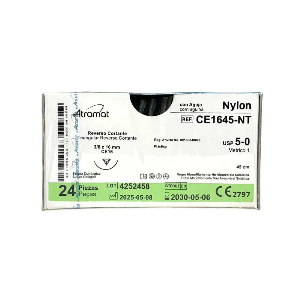 O Fio de Sutura Nylon Preto 5-0 - CE1645-NT da Atramat é um fio monofilamentar não absorvível de alta resistência, desenvolvido para suturas precisas e duráveis em tecidos moles. Produzido com poliamida (nylon), proporciona excelente manuseio, deslizamento suave e mínima reação inflamatória. Equivalente técnico ao Mononylon 1168T, oferece desempenho confiável e acabamento estético superior, sendo amplamente utilizado em cirurgias plásticas, odontológicas, oftalmológicas e microcirurgias.