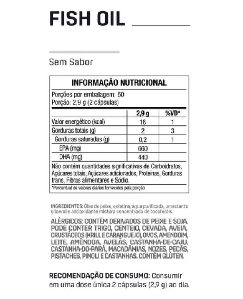 O FISH OIL OMEGA-3 premium altamente concentrado em EPA e DHA, formulado com matéria-prima importada (MEG-3), com certificação IFOS e elevado grau de pureza. O FISH OIL OMEGA-3™ é um suplemento premium, formulado com óleo de sardinha e salmão ultrafiltrado para garantir máxima pureza e alta biodisponibilidade. Cada porção de 2 cápsulas oferece 660 mg de EPA e 440 mg de DHA, essenciais para a saúde do organismo como um todo. Conta com o selo MEG-3®, certificação internacional que assegura qualidade e pureza superiores. Perfeito para quem busca mais saúde, bem-estar e suporte nutricional diário. Para todos que buscam escolhas mais saudáveis e melhorar o funcionamento do organismos de forma geral. O ômega-3 é um tipo de gordura saudável essencial para o organismo, encontrado principalmente em peixes de água fria (como salmão e sardinha), linhaça, chia e nozes. Ele desempenha diversas funções importantes no corpo, incluindo: Saúde cardiovascular, função cerebral e cognitiva, ação anti-inflamatória, saúde mental, entre outros.
