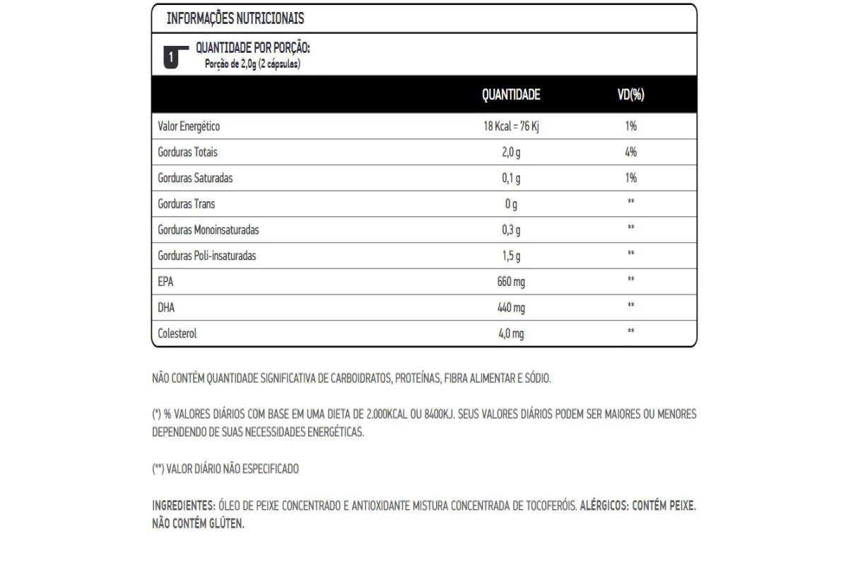 Especialmente desenvolvido para atletas, o Fish Oil é um avançado complexo de ômega 3 Ultra Puro e altamente eficaz, com 2000mg de óleo de peixe, cada porção contém 660mg de EPA e 440mg de DHA, dois dos principais tipos de ácidos graxos.