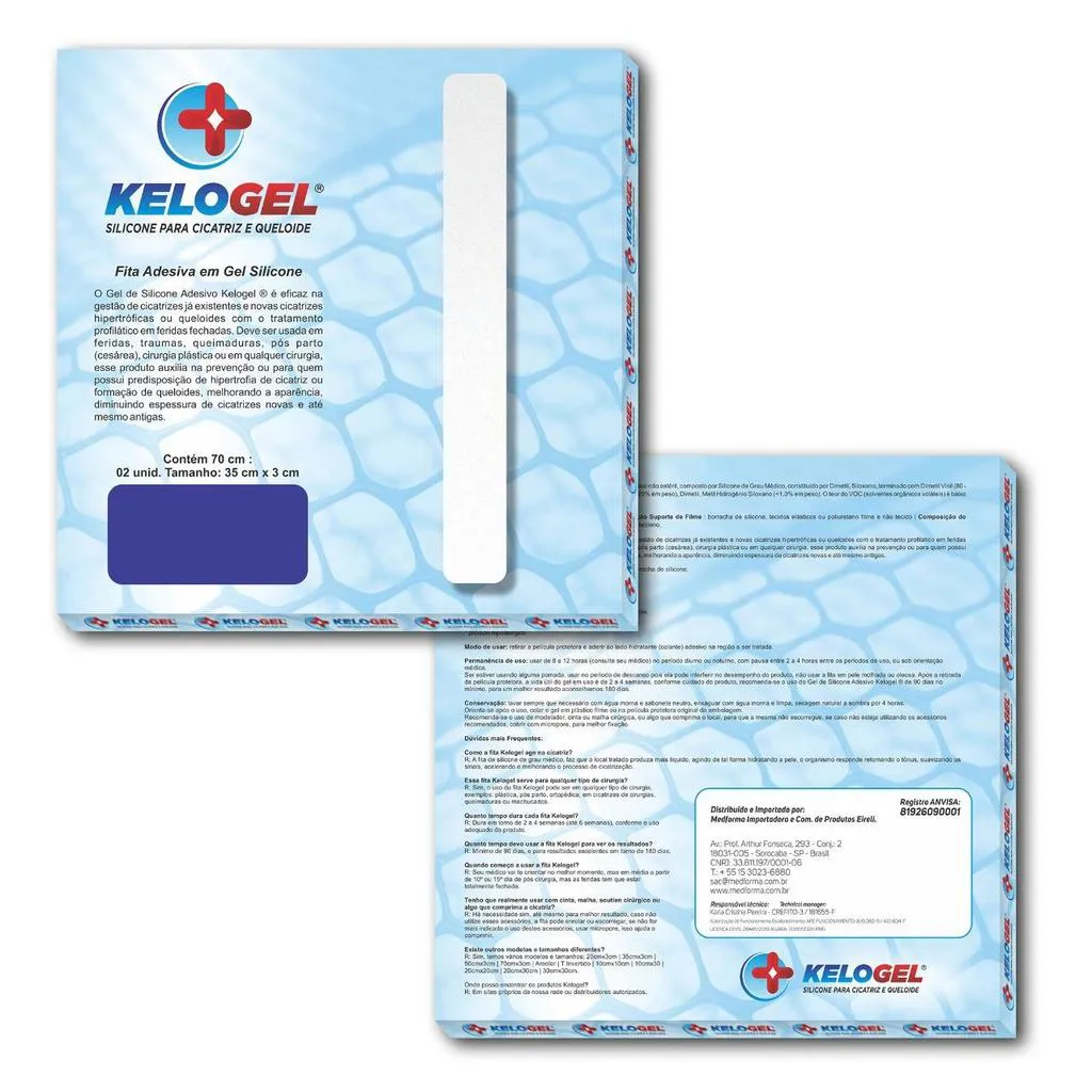 Indicação: O Gel de Silicone Adesivo Kelogel® é eficaz no tratamento de cicatrizes, cicatrizes hipertróficas e queloides em feridas fechadas. É indicado para uso em feridas, traumas, queimaduras, pós-parto (cesárea), cirurgias plásticas ou outras, auxiliando na prevenção de hipertrofia de cicatriz ou formação de queloides, melhorando a aparência e diminuindo a espessura de cicatrizes novas e antigas. Benefícios: Cicatrizes mais claras, menos avermelhadas e menos espessas. Contraindicação: Evite o uso do produto se for alérgico a borracha de silicone. Não use em feridas não cicatrizadas. Modo de usar: Higienize as mãos, certificando-se de que estejam livres de produtos oleosos. Limpe e sanitize a pele onde será aplicado, não use pomada, creme ou algo oleoso. Seque, retire a película protetora e aplique o lado colante na região. Use de 8 a 12 horas diurnas ou noturnas, com pausas de 2 a 4 horas entre os períodos de uso ou conforme orientação médica. Se estiver usando pomada, aplique durante o período de descanso, pois pode interferir no desempenho do produto. Após a retirada da película protetora, a vida útil do gel é de 2 a 4 semanas, dependendo dos cuidados. Recomenda-se o uso do Gel por no mínimo 90 dias, aconselhando-se 180 dias para melhores resultados. Conservação: Lave sempre que necessário com água morna e sabonete neutro, enxague com água morna, deixe secar naturalmente à sombra por 4 horas. Use modelador, cinta ou malha cirúrgica para comprimir o local e evitar que escorregue, cobrindo com micropore para melhor fixação. REGISTRO ANVISA/ MS nº 81926090001