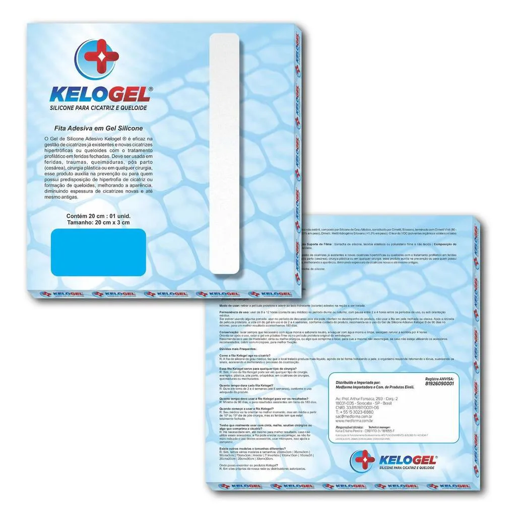 Indicação: O Gel de Silicone Adesivo Kelogel® é eficaz no tratamento de cicatrizes, cicatrizes hipertróficas e queloides em feridas fechadas. É indicado para uso em feridas, traumas, queimaduras, pós-parto (cesárea), cirurgias plásticas ou outras, auxiliando na prevenção de hipertrofia de cicatriz ou formação de queloides, melhorando a aparência e diminuindo a espessura de cicatrizes novas e antigas. Benefícios: Cicatrizes mais claras, menos avermelhadas e menos espessas. Contraindicação: Evite o uso do produto se for alérgico a borracha de silicone. Não use em feridas não cicatrizadas. Modo de usar: Higienize as mãos, certificando-se de que estejam livres de produtos oleosos. Limpe e sanitize a pele onde será aplicado, não use pomada, creme ou algo oleoso. Seque, retire a película protetora e aplique o lado colante na região. Use de 8 a 12 horas diurnas ou noturnas, com pausas de 2 a 4 horas entre os períodos de uso ou conforme orientação médica. Se estiver usando pomada, aplique durante o período de descanso, pois pode interferir no desempenho do produto. Após a retirada da película protetora, a vida útil do gel é de 2 a 4 semanas, dependendo dos cuidados. Recomenda-se o uso do Gel por no mínimo 90 dias, aconselhando-se 180 dias para melhores resultados. Conservação: Lave sempre que necessário com água morna e sabonete neutro, enxague com água morna, deixe secar naturalmente à sombra por 4 horas. Use modelador, cinta ou malha cirúrgica para comprimir o local e evitar que escorregue, cobrindo com micropore para melhor fixação. REGISTRO ANVISA/ MS nº 81926090001