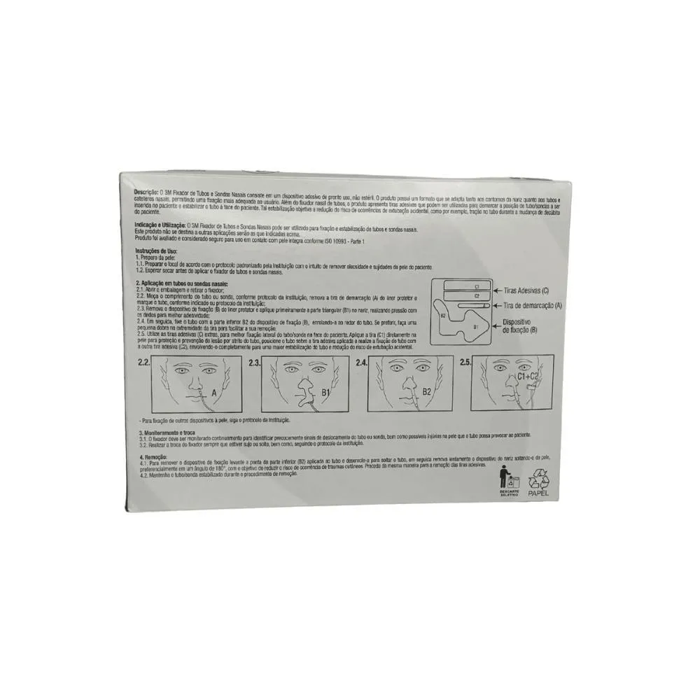 O Fixador de Tubos e Sondas Nasais 3M é um dispositivo adesivo estéril projetado para fixar tubos endotraqueais, sondas nasogástricas e nasoenterais. Fabricado com adesivo hipoalergênico, possui design ergonômico adaptado à anatomia do rosto e nariz.