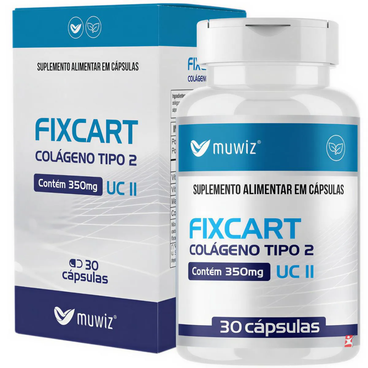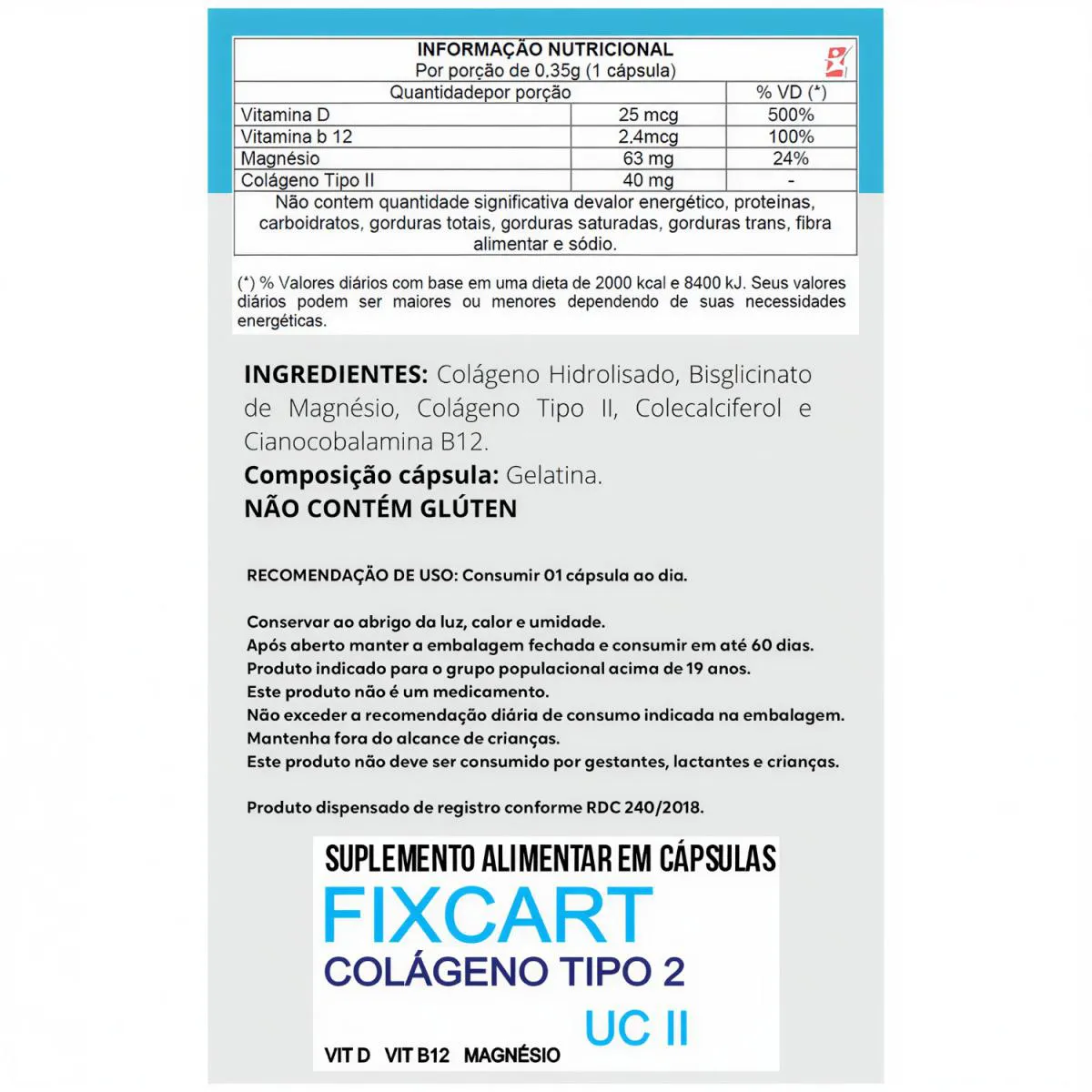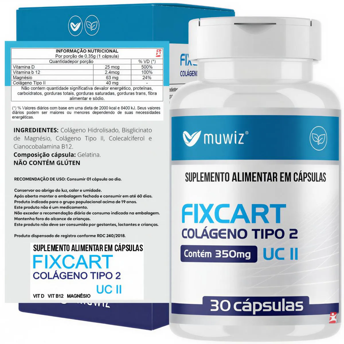 DESCRIÇÃO Fixcart é um suplemento alimentar em cápsulas da Muwis, desenvolvido com colágeno tipo II não desnaturado (UC-II®), magnésio, vitamina D e vitamina B12. Essa combinação é indicada para complementar a alimentação, especialmente em dietas com maior demanda nutricional para manutenção da integridade estrutural do organismo. A forma UC-II® é reconhecida por ser uma matéria-prima de colágeno tipo II não desnaturado, com pureza e estabilidade, amplamente utilizada em suplementos alimentares. BENEFÍCIOS NUTRICIONAIS - Apenas 1 cápsula ao dia; - A vitamina d auxilia na absorção de cálcio e na manutenção de ossos normais; - O magnésio contribui para o funcionamento muscular e equilíbrio eletrolítico; - A vitamina B12 auxilia no metabolismo energético; - O colágeno é uma proteína estrutural naturalmente presente nas cartilagens; - SEM GLÚTEN. RECOMENDAÇÃO DE USO Ingerir 1 cápsula ao dia, preferencialmente com uma refeição, ou conforme orientação de médico ou nutricionista. TABELA NUTRICIONAL - COMPOSIÇÃO - RECOMENDAÇÕES & CUIDADOS Anexo nas imagens do anúncio. REGISTRO ANVISA Produto dispensado de registro conforme RDC 240/2018.