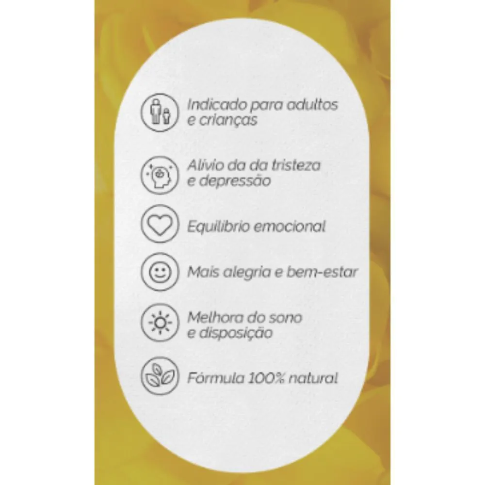 Encontre alívio para a tristeza nos dias difíceis. Redescubra a alegria em cada momento e viva com tranquilidade. Sua vida com mais leveza e alegria.Traga de volta o brilho da felicidade para o seu dia a dia.Com Be Happy, você pode deixar para trás a tristeza e encontrar conforto nas suas emoções. Desenvolvido especialmente para auxiliar tanto adultos quanto crianças, este floral é um grande aliado no combate à depressão, à melancolia e ao desânimo do dia a dia. Sua fórmula equilibrada promove harmonia emocional, ajudando a transformar sentimentos negativos em sensações de bem-estar e leveza. Sinta-se renovado, resgate sua alegria e redescubra o prazer nas pequenas coisas da vida. Permita-se viver com mais serenidade, equilíbrio e felicidade genuína. Be Happy é mais do que um floral, é um convite para um novo olhar sobre a vida!