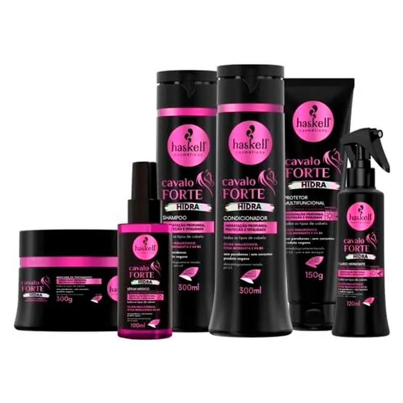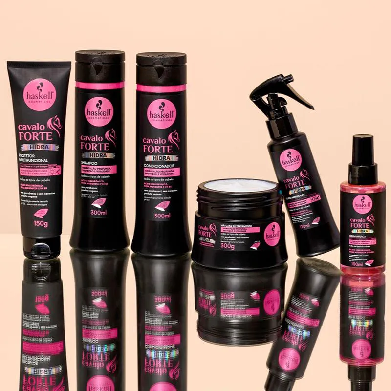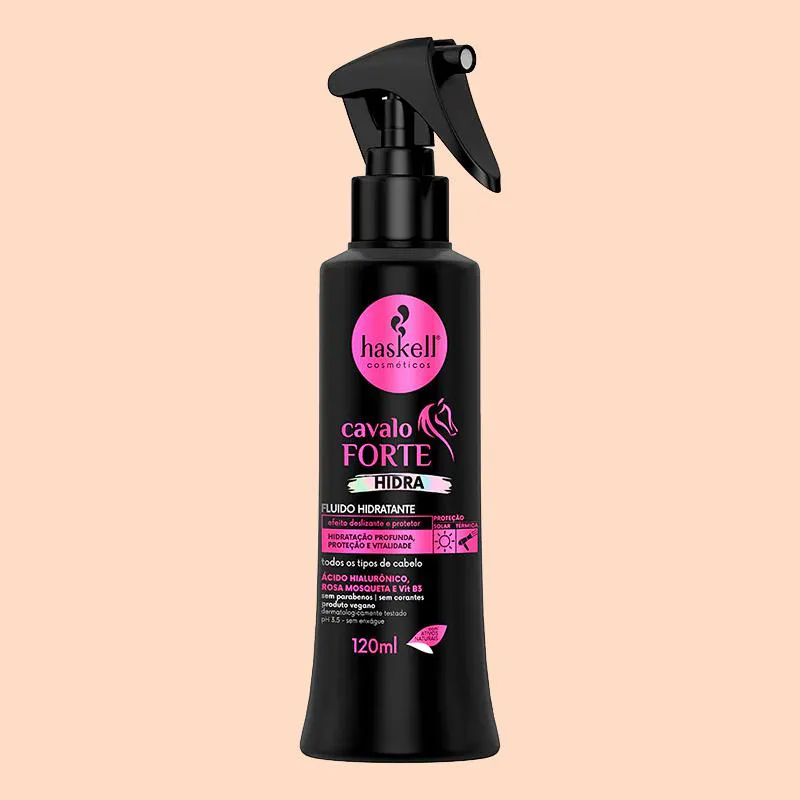 Fluido Hidratante Cavalo Forte Hidra 120ml - Haskell BENEFÍCIOS Indicação: para todos os tipos de cabelo finalizador aquoso com alto potencial de redução do frizz Proporciona maciez e sedosidade aos fios, facilitando o desembaraçar pH 3.5 Vegano Sem parabenos / sem corantes Proteção térmica / proteção solar Sem enxágue Low poo A linha Cavalo Forte Hidra foi especialmente desenvolvida para realizar a reposição hídrica nos fios. Ela proporciona hidratação intensa e brilho extra à fibra capilar. Direção olfativa: cítrico frutal COMO USAR Agite antes de usar. Nos cabelos limpos e úmidos, borrife o Fluido Hidratante em todo o comprimento dos fios e espalhe uniformemente pelos cabelos. Finalize como desejar. Sem enxágue. Potencialize os resultados utilizando toda a linha Cavalo Forte Hidra. INGREDIENTES Água, propilenoglicol, carbonato de dicaprilila, álcool cetoestearílico, álcool benzílico, óleo do fruto de rosa canina, nicotinamida, hialuronato de sódio acetilado, hialuronato de sódio, crospolímero de hialuronato sódico, hialuronato de sódio hidrolisado, perfume, ésteres PEG-7 do óleo de oliva, óleo de coco, amodimeticona, álcool cetílico, álcool estearílico, metossulfato de beentrimônio, ácido láctico, octinoxato, copolímero de amodimeticona/morfolinometil silsesquioxano, metossulfato de dipalmitoiletil hidroxietilmônio, glicerol, beenamidopropil dimetilamina, pentaeritritil tetra-di-butil hidroxi-hidrocinamato, pantenol, polietilenoglicol-5 éter de álcool tridecílico, ácido benzóico, edetato dissódico, limoneno, polietilenoglicol-10 éter de álcool tridecílico, pidolato de sódio, ácido sórbico, linalol, lactato de sódio, arginina, poliquatérnio-68, hexil cinamal, ácido aspártico, cloreto de cetrimônio, salicilato de benzila, ácido pidólico, isopropanolamina, fenoxietanol, glicina, alanina, citronelol, cumarina, serina, manteiga da semente de coco, ácool benzílico, valina, geraniol, prolina, treonina, isoleucina, cloreto de beentrimônio, lauromacrogol 400, óleo de linhaça, tocoferol, histidina, fenilalanina, butil-hidroxitolueno, etilhexilglicerina, pentilenoglicol, benzoato de sódio, ácido cítrico, sorbato de potássio, óleo de semente de girassol. Imagens Meramente Ilustrativas. Todas as Informações Divulgadas são de Responsabilidade Exclusiva do Fabricante/fornecedor.