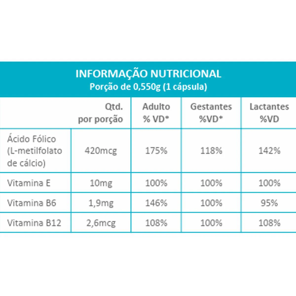 - Suporte nutricional com L-metilfolato, importante para processos metabólicos do organismo.