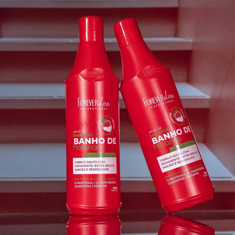 O shampoo Banho de Verniz Morango de Forever Liss limpa e repara, devolvendo vitalidade e brilho tridimensional a todos os tipos de cabelos, principalmente opacos e danificados.