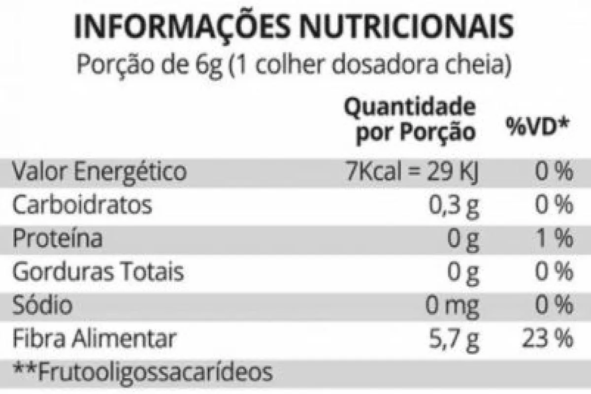 5,8g 2% Fibra Alimentar 5,7g 23% * % Valores Diários com base em uma dieta de 2.000Kcal ou 8400kJ. Seus valores diários podem ser maiores ou menores dependendo das suas necessidades energéticas. Obs: Pode haver pequenas variações na informação nutricional, conforme o sabor. Sugestão de uso: adicionar 1 colher dosadora (cheia) em um copo com água, suco ou alimento conforme sua preferência, mexer até completa dissolução. Adultos consumir 1 a 2 doses ao dia. Ou como indicação profissional.