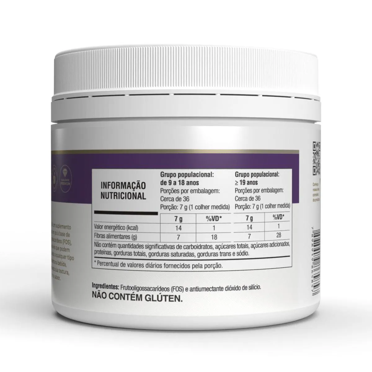 - Selo de Qualidade VLabor. Recomendações de uso: Suplemento alimentar de uso adulto e infantil (a partir de 9 anos de idade): ingerir 7 g (1 colher medida) ao dia ou seguir a recomendação de um profissional da saúde. Modo de uso: Dissolva 7 g (1 colher medida) em aproximadamente 100 mL de água ou na sua bebida favorita e misture até total homogenização. Beba imediatamente após o preparo. Ingredientes: Futooligossacarídeos (FOS) e antiumectante dióxido de silício. NÃO CONTÉM GLÚTEN. Cuidados e conservação: - Manter o produto bem fechado e conservar ao abrigo da luz, calor, odor e umidade.