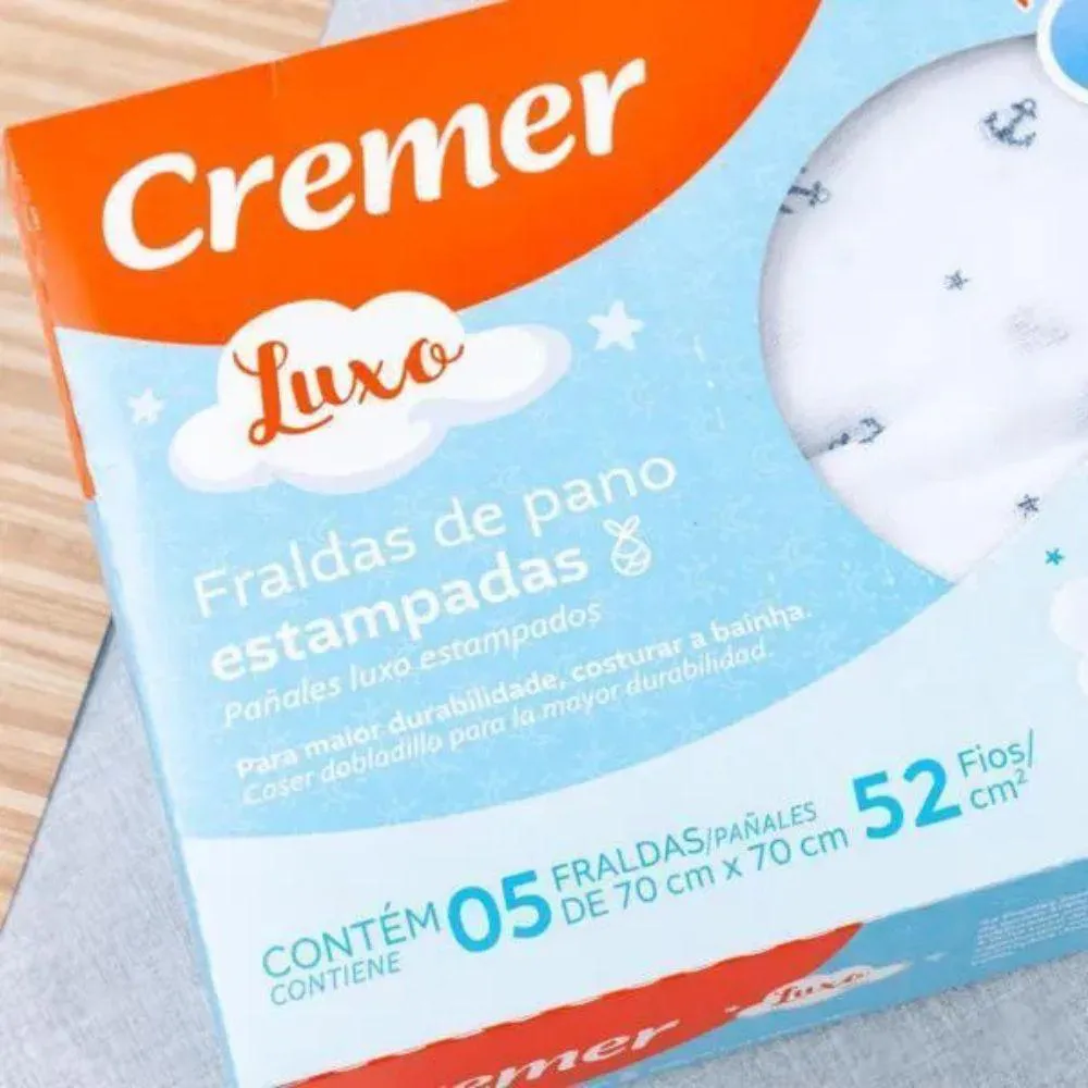 A linha luxo e a de maior qualidade da Cremer e a mais desejada pelas Mamaes. A Fralda mais vendida de toda a categoria nao pode faltar no enxoval do bebe. Pode ser usada como cheirinho na hora da naninha, protecao contra o vento e o sol, protetor de carrinho, base de trocador etc. As embalagens em caixa sao otimas para presentear. Cuidado, dedicacao e muito carinho sao os principais ingredientes na criacao e desenvolvimento de produtos para bebes. A Cremer leva isso muito a serio e e muito rigorosa em tudo o que faz, escolhe as melhores materias primas, desenvolve novas tecnologias e respeita o meio ambiente. Tudo para que seu bebe tenha um produto de alta qualidade e duravel. Caracteristicas: Marca: Cremer Colecao: Luxo Material: 100% algodao Padrao: Naval Contem: 5 Unidades Quantidades de fios: 52 Tecido: Duplo Com Bainha: Sim Tamanho: 70x70 Marca: Cremer Material: 100% algodao Cuidados: - Lavar a mao - Nao alvejar - Nao limpar a seco - Secagem em varal - Passar em temperatura baixa