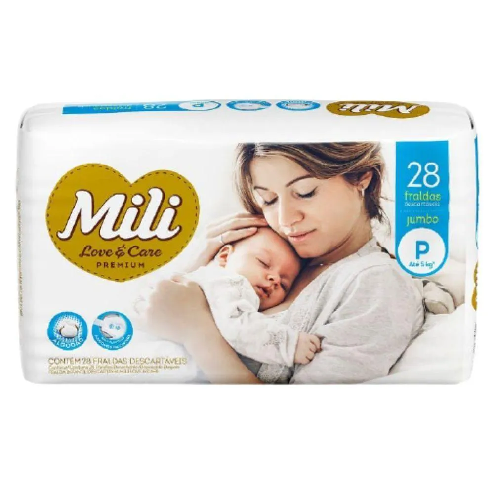 Fralda Descartável Mili - LoVe & Care - Linha PremiunTamanho: PQuantidade: 6 pacotes contendo 28 fraldas cada (total: 168 unidades)tamanho P - (para bebês até 5 Kg)A Mili Love & Care é uma fralda que foi lançada para surpreender você.Com até 12 horas de proteção, ela oferece todo o cuidado e suavidade que seu filho precisa para ficar sempre sequinho e confortável.A pele respira mais, a fralda se ajusta bem e o bebê se sente melhor.-Toque macio-Gel absorvente- Abas elásticas- Com extrato de algodão - deixa a pele respirar- Máxima proteção - 6 camadas que deixam o bebê protegido e sequinho