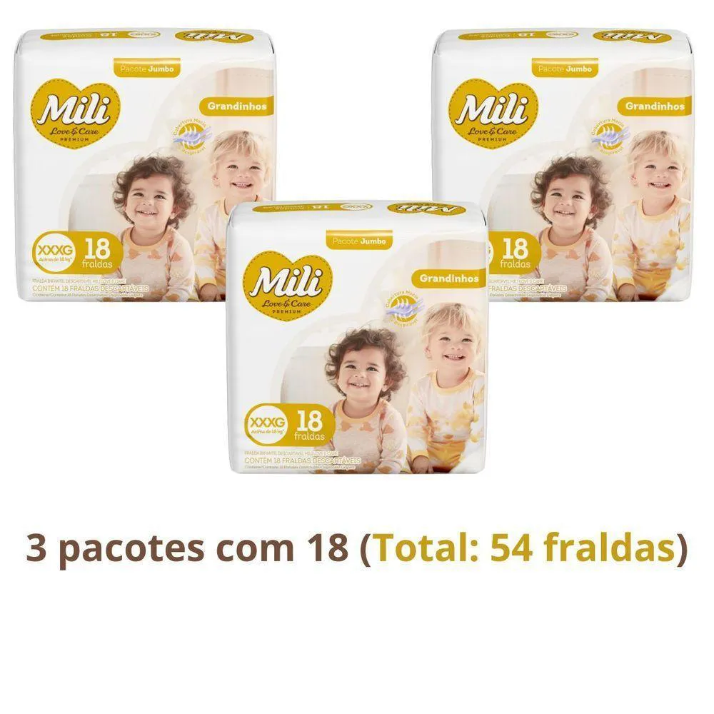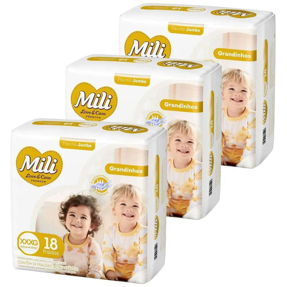 Fralda Descartável Mili Love & Care Linha PremiumTamanho: XXXG (indicado para bebês acima de 18 kg - Grandinho)Quantidade: 3 Pacotes com 18 fraldas (Total: 54 fraldas)Marca: MiliFralda confeccionada pela moderna tecnologia Mili que vai atender as expectativas de quem procura o melhor para o seu bebe: qualidade, conforto e praticidade.A Mili Love & Care é uma fralda que vai surpreender você.Oferece todo o cuidado e suavidade que seu filho precisa para ficar sempre sequinho e confortável.A pele respira mais, a fralda se ajusta bem e o bebê se sente melhor.-Toque macio - Gel