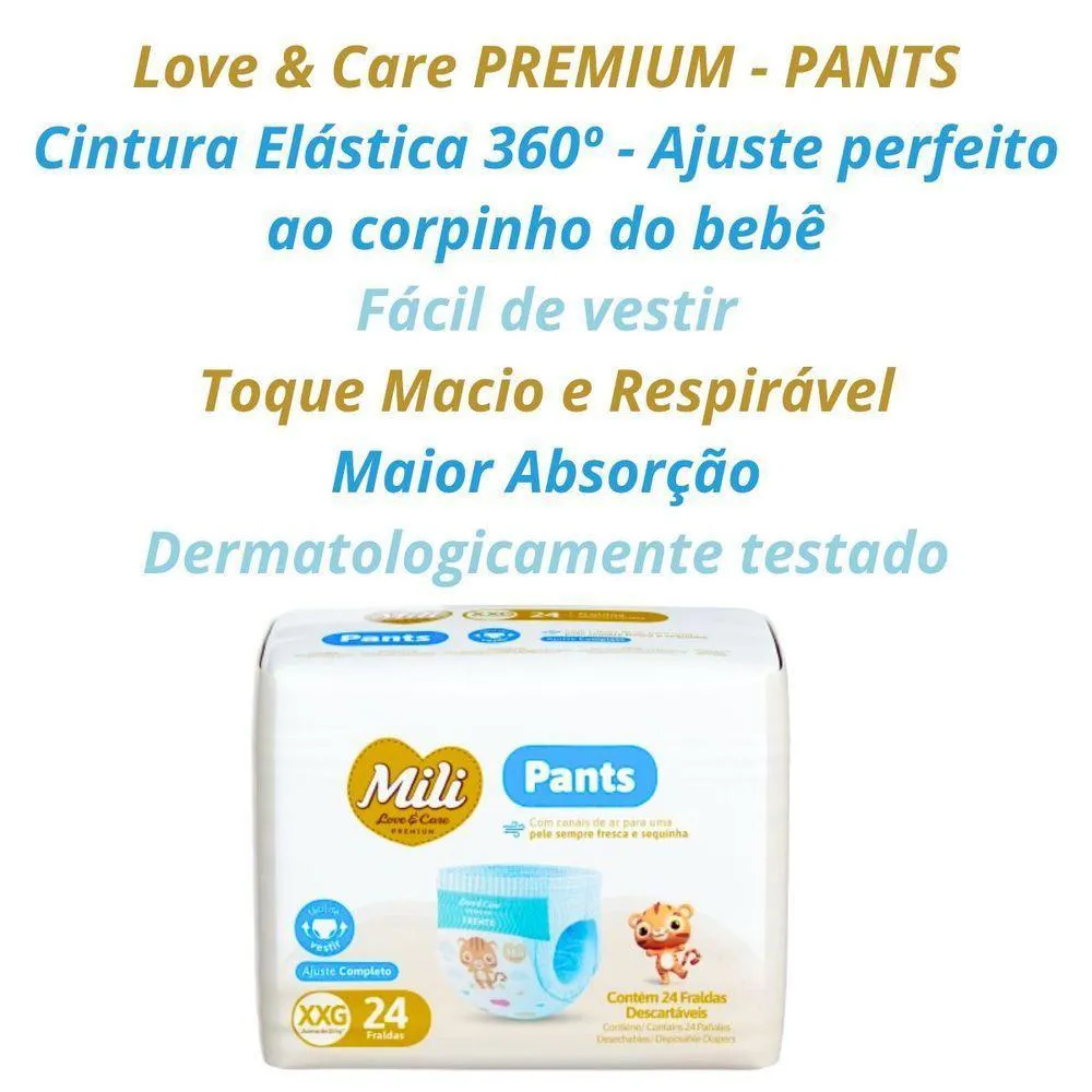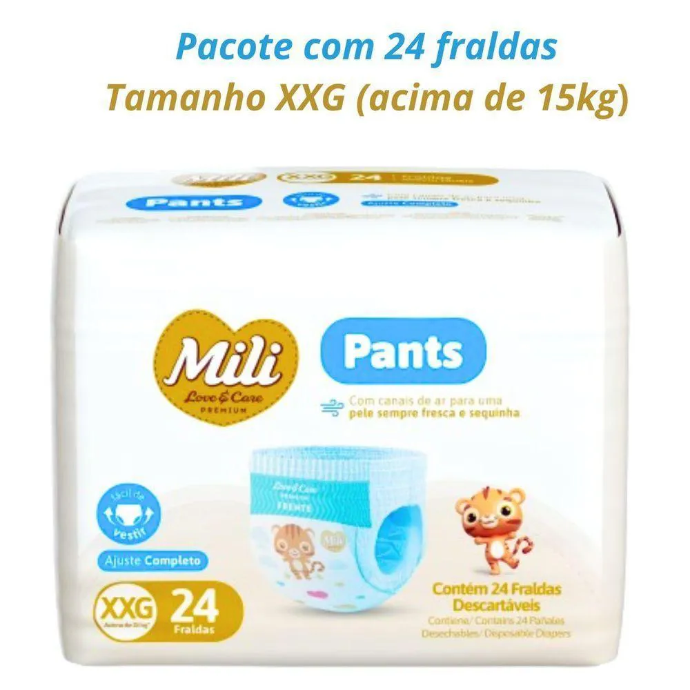 Fralda Descartável Mili Love & Care PREMIUM PANTS (Tamanho XXG) cintura elástica 360ºIdeal para bebês acima de 15 kg (Tam XXG)Pacote com 24 fraldasConforto e Proteção para o Seu Bebê!A Mili Love & Care PREMIUM PANTS foi desenvolvida pensando no bem-estar do seu bebê. Com cintura elástica 360º, oferece um ajuste perfeito e é super fácil de vestir, garantindo a praticidade que você precisa no dia a dia. Absorção Máxima: Mais camadas de gel absorvente para manter a pele do seu bebê seca por mais tempo. Toque Macio e Respirável: Cobertura suave que permite a circulação de ar, mantendo a pele fresquinha e confortável. Dermatologicamente Testado: Segurança e cuidado comprovados para a pele delicada do seu bebê. Pele Sempre Fresca: Canais de ar que ajudam a manter a pele do seu bebê arejada e sequinha.Essas fraldas são a escolha perfeita para garantir noites tranquilas e dias de muita diversão.(Nº NOTIFICAÇÃO ANVISA 25351.194038/2019-01)