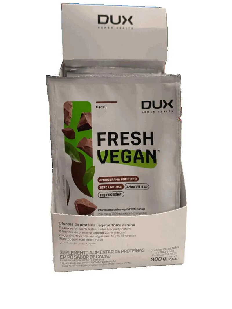 Fresh Vegan (Display 10 unid. 30g) Fresh Vegan da DUX Nutrition Lab é uma nova categoria de proteínas 100% vegetal, feita com frutas de verdade e ingredientes naturais, que proporcionam sabores reais, combinados em uma fórmula limpa e pura. Uma proteína saudável e deliciosa, para todos.Fórmula rigorosamente limpa e pura, feita exclusivamente com matérias-primas naturais, sem ingredientes inferiores ou artificiais. O Fresh Vegan da DUX Nutrition Lab segue um padrão de excelência na escolha de cada proteína, fruta e ingrediente. É assim que se garante um produto para consumidores tão exigentes como nós.As proteínas vegetais têm muitos benefícios. Possuem uma menor quantidade de calorias e gorduras, boa digestibilidade e são ricas em fibras, tanto solúveis como as insolúveis. Além disso, podem ser consumidas por mais pessoas: veganos, vegetarianos, intolerantes à lactose e qualquer um que deseje diminuir o consumo de produtos animais.Assim, desenvolver uma proteína completa e 100% vegetal não era um mero objetivo, era uma exigência da Dux. Queríamos produzir uma proteína vegetal que entregasse a mesma qualidade e performance das nossas proteínas do leite: um nível de excelência que busca para todos os seus produtos. Benefícios:* Sabores irresistíveis;* Sem conservantes;* Sem ingredientes artificiais ou inferiores;* Proteínas 100% vegetal;* 22g de proteína por porção.