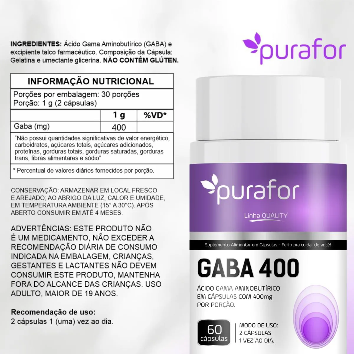Promove relaxamento, melhora o sono e ajuda no equilíbrio mental e emocional diário. O GABA 400 Purafor é um suplemento de alta pureza que fornece 400mg de Ácido Gama Aminobutírico (GABA) por porção.