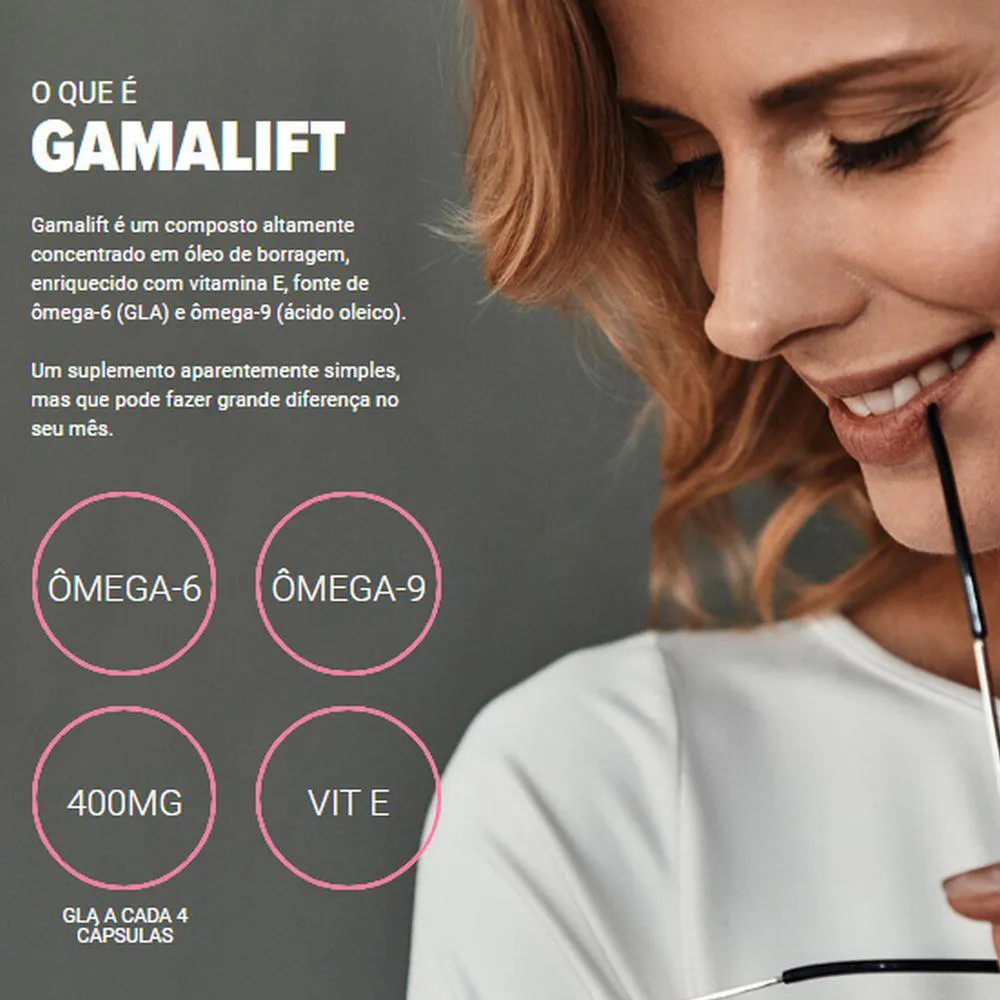 Gamalift é um composto altamente concentrado em óleo de borragem, enriquecido com vitamina e, fonte de ômega-6 (GLA) e ômega-9 (ácido oleico). Um suplemento aparentemente simples, mas que pode fazer grande diferença no seu mês.
