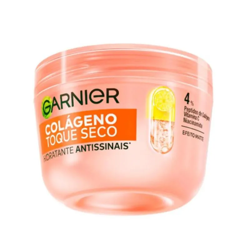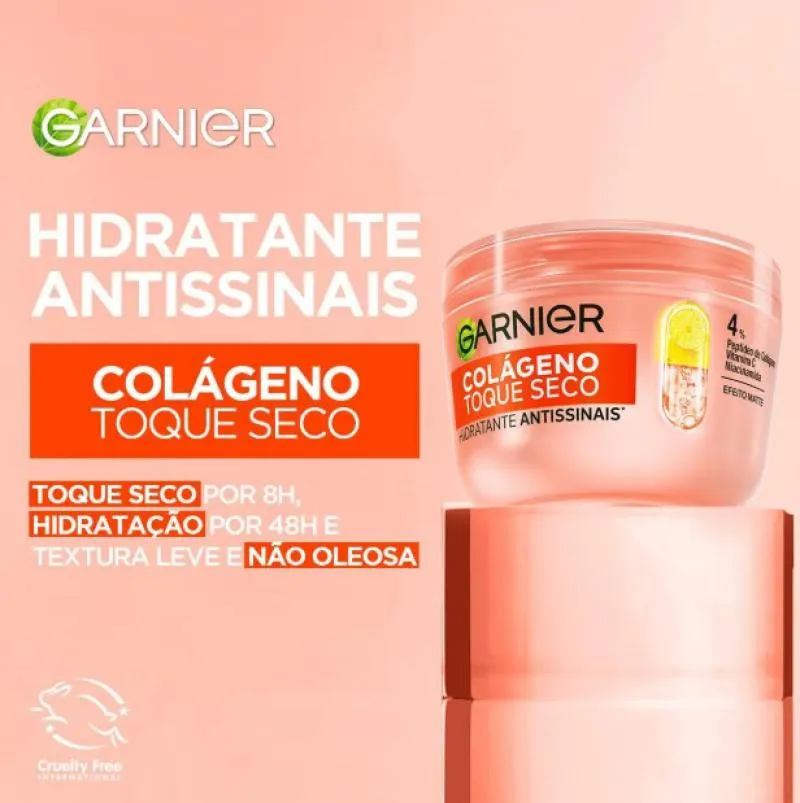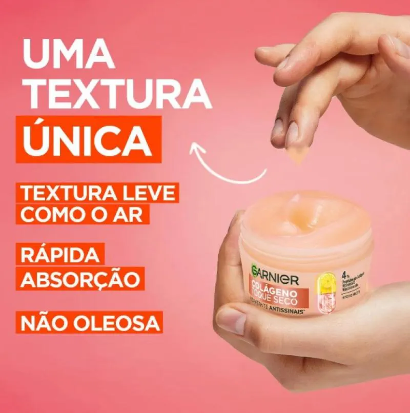 Garnier colágeno Toque Seco é um hidratante facial antissinais com textura especialmente desenvolvida para peles mistas e oleosas. Ele hidrata, reduz a oleosidade e garante 8 horas de toque seco. Podendo ser usado diariamente na sua rotina de skincare e em todos os tipos de pele, sua fórmula com 4% de Peptídeos de Colágeno, Niacinamida e vitamina c, aumenta a firmeza e a elasticidade da pele, uniformiza, controla a oleosidade, além de hidratar sem pesar. Possui uma textura que não é gel e não é creme, só experimentando para sentir. O resultado é uma pele limpa, uniformizada, hidratada, com toque seco e suave.