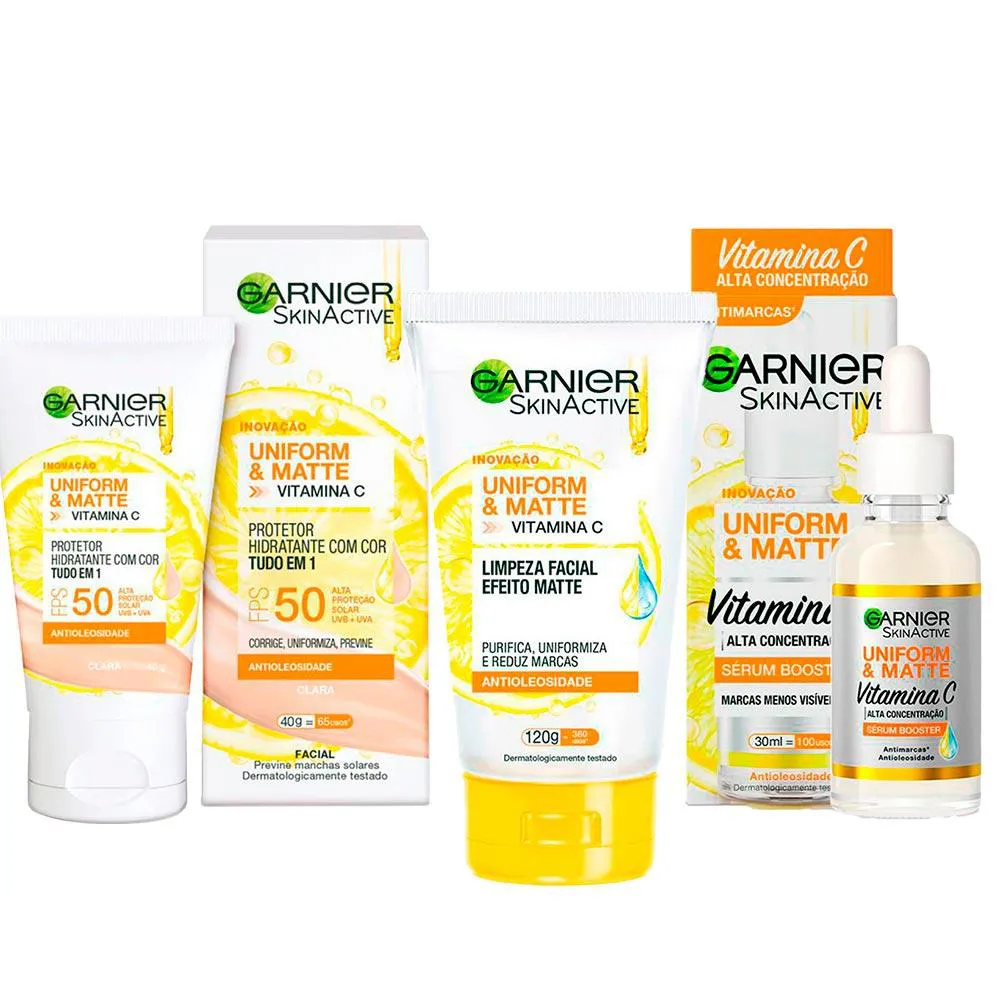 Garnier Skin Uniform & Matte Vitamina C Kit – Sérum Facial + Gel de Limpeza + Protetor Solar Fps50 Cor Clara