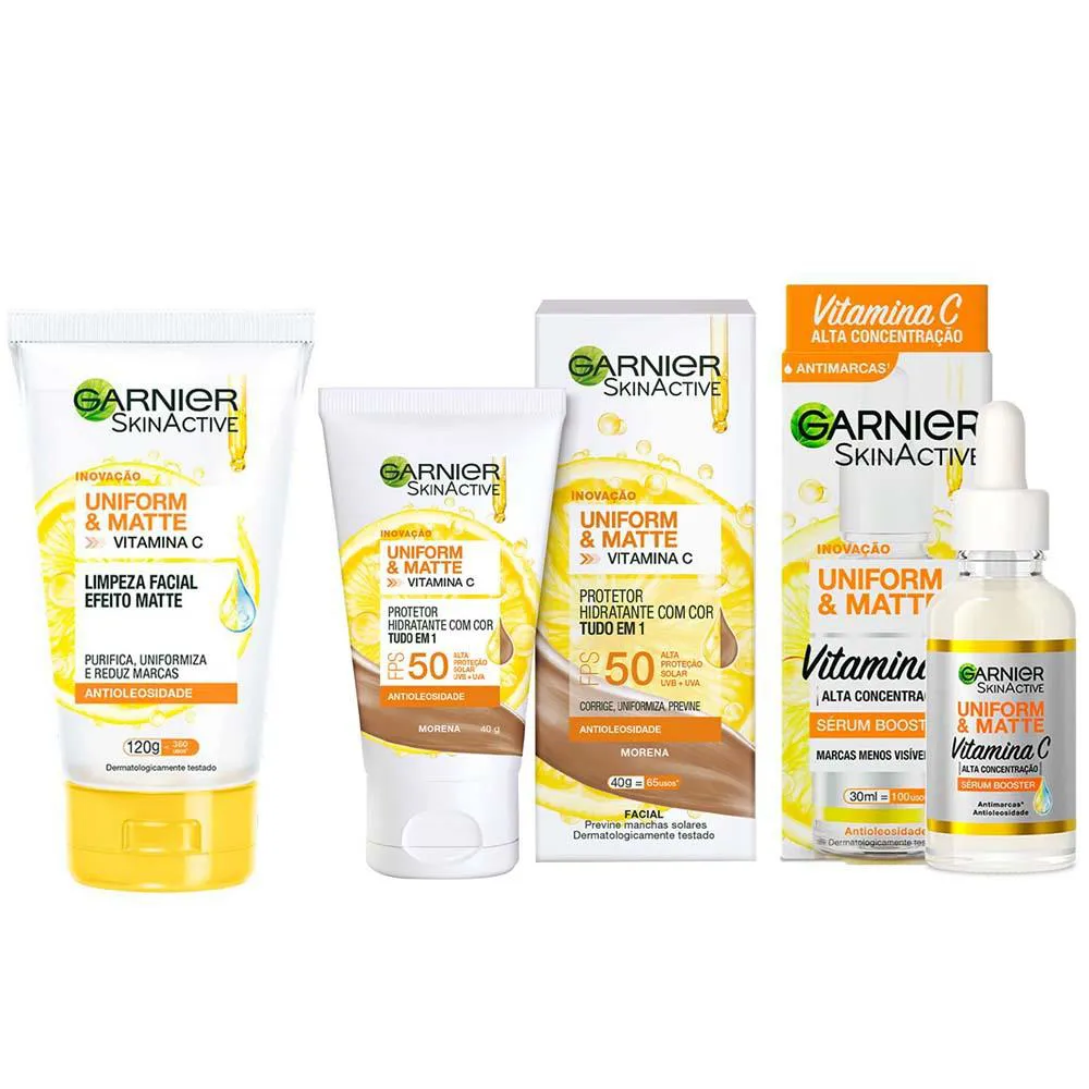 Garnier Skin Uniform & Matte Vitamina C Kit – Sérum Facial + Gel de Limpeza + Protetor Solar Fps50 Cor Morena