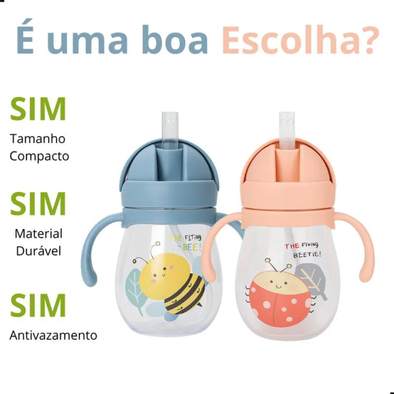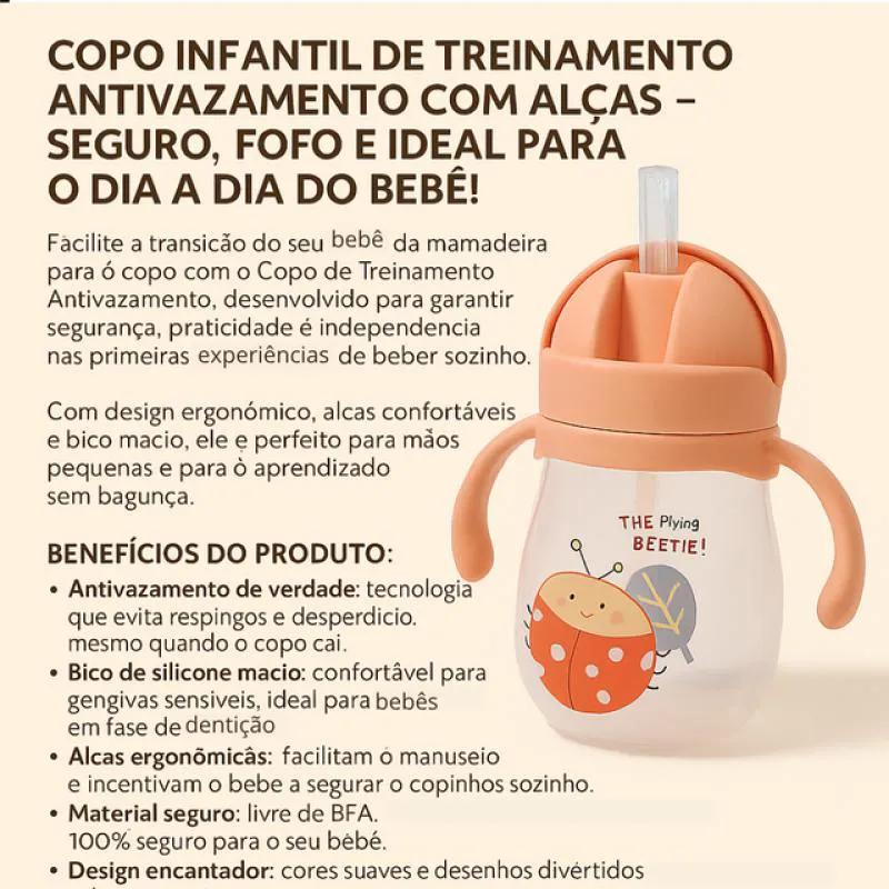 Copo infantil de Treinamento Antivazamento com Alças – Seguro, Fofo e Ideal para o Dia a Dia do Bebê! Facilite a transição do seu bebê do mamadeirinha para o copo com o Copo de Treinamento Antivazamento, desenvolvido para garantir segurança, praticidade e independência nas primeiras experiências de beber sozinho. Com design ergonômico, alças confortáveis e bico macio, ele é perfeito para mãos pequenas e para o aprendizado sem bagunça. Benefícios do Produto: Antivazamento de verdade: tecnologia que evita respingos e desperdício, mesmo quando o copo cai. Bico de silicone macio: confortável para gengivas sensíveis, ideal para bebês em fase de dentição. Alças ergonômicas: facilitam o manuseio e incentivam o bebê a segurar o copinho sozinho. Material seguro: livre de BPA, ftalatos e substâncias tóxicas — 100% seguro para o seu bebê. Design encantador: cores suaves e desenhos divertidos que tornam as refeições mais alegres. Fácil de limpar: desmonta facilmente e pode ser lavado à mão ou na lava-louças. Ideal Para: Bebês e crianças em fase de transição alimentar, proporcionando autonomia, conforto e segurança nas refeições. Perfeito para uso em casa, passeios, viagens e creches. Especificações Técnicas: Capacidade: 350 ml Material: Polipropileno + Silicone alimentar Idade recomendada: a partir de 6 meses Livre de BPA e substâncias tóxicas Item incluso: 1 Copo Infantil de Treinamento com Alças e Tampa