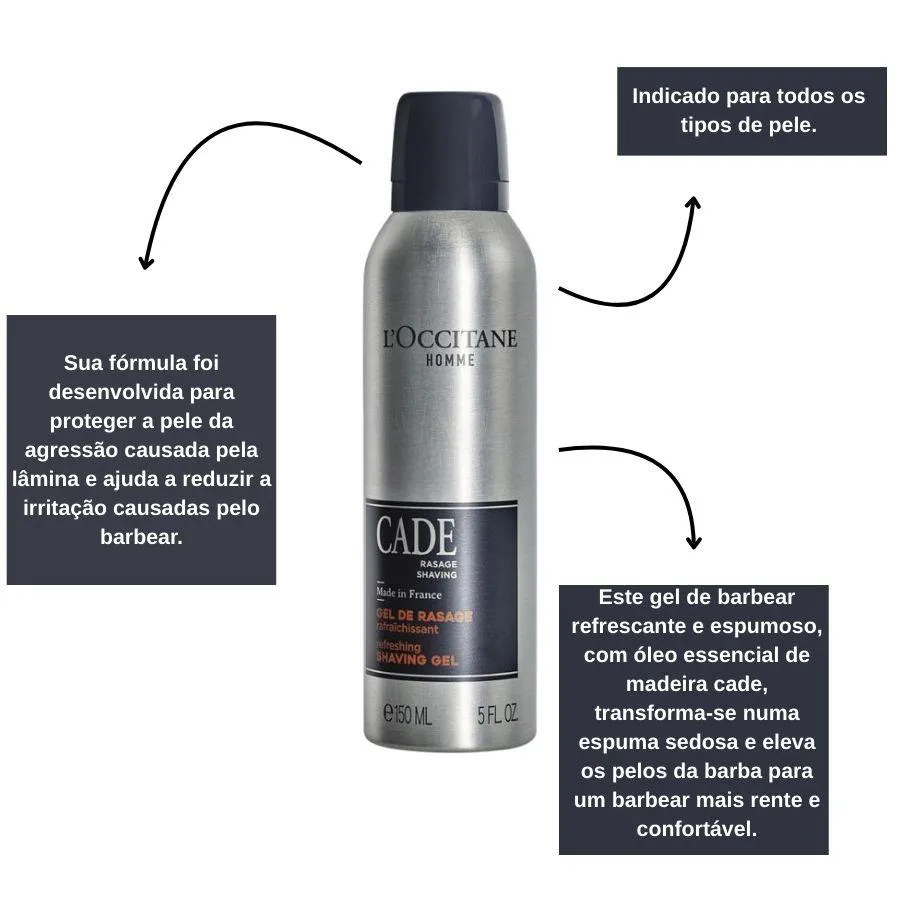 O Gel de Barbear JHomme L'Occitane Cade conta com o óleo essencial de madeira Cade, proveniente de uma planta nativa de Provence, na região do Mediterrâneo francês. Esse óleo possui propriedades fortificantes e, ao longo das gerações, os pastores de Provence têm utilizado o óleo de Cade para proteger o rosto. Agora, você pode desfrutar dos benefícios dessa tradição em sua rotina de barbear.