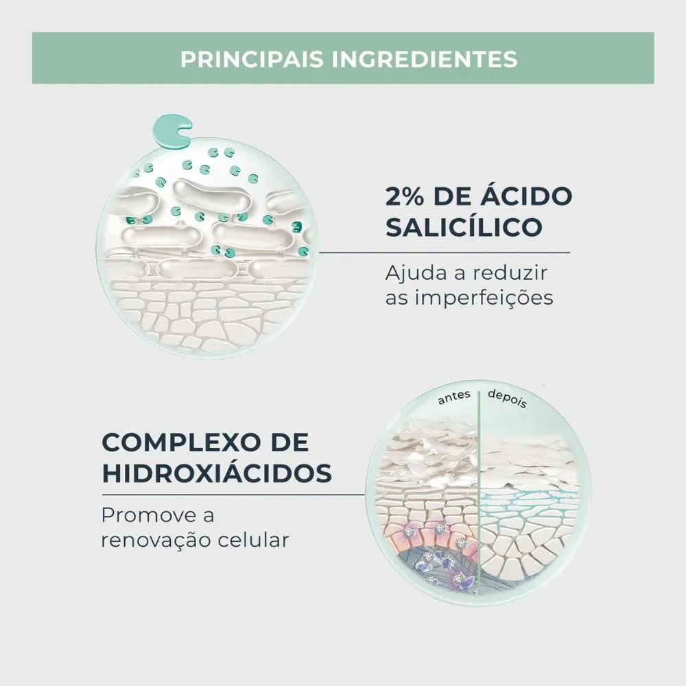 2% Ácido Salicílico: Esfoliação eficaz que desobstrui poros e previne novas imperfeições