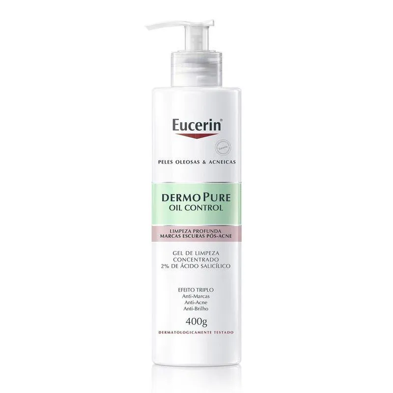 DermoPure Oil Control Gel de Limpeza Concentrado é um gel de limpeza dermatológico, desenvolvido especialmente para peles oleosas e acneicas. Sua fórmula concentrada oferece um efeito triplo, combatendo marcas, acne e o brilho excessivo da pele. Limpa profundamente a pele, removendo impurezas, cravos e excesso de oleosidade, ao mesmo tempo em que ajuda a combater espinhas, reduzir marcas pós-acne e controlar o brilho excessivo. Ele promove renovação celular e melhora a textura da pele, sem ressecar ou obstruir os poros. Quais os benefícios do DermoPure Oil Control? - Limpeza profunda e concentrada; - Antiacne; - Antimarcas; - Antibrilho; - Para pele oleosa e acneica; - Para o rosto e corpo; - 2% de ácido salicílico; - Com complexo de hidroxiácidos; - Fórmula não comedogênica. Modo de uso: 1. Aplique o Gel de Limpeza Facial Concentrado Eucerin - DermoPure Oil Control no rosto molhado fazendo espuma, massageando suavemente e enxaguando abundantemente na sequência. 2. Aplique de manhã e/ou à noite.