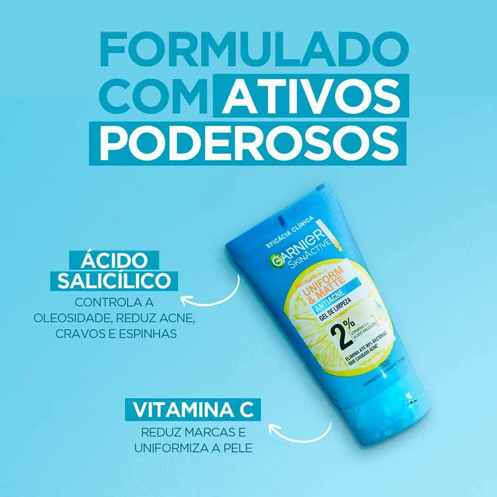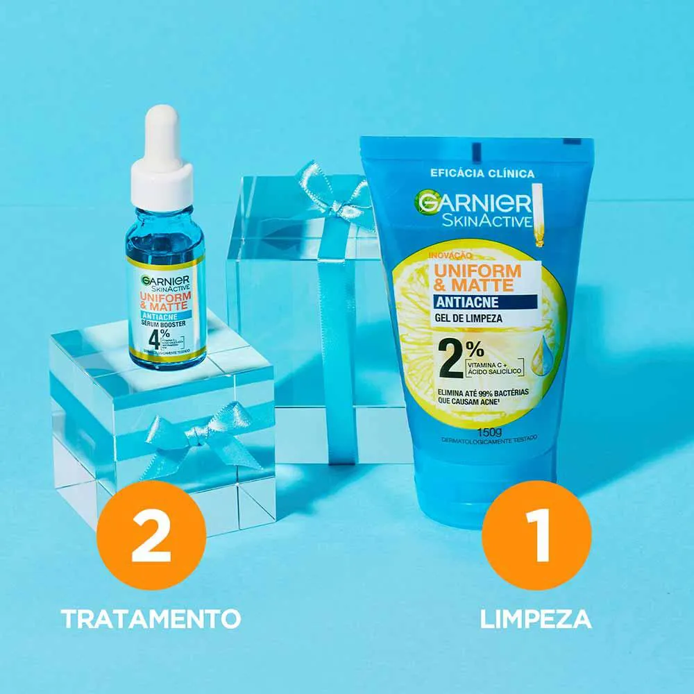 O Gel de Limpeza Antiacne Uniform & Matte da Garnier é a nova geração de cuidado para peles oleosas e acneicas. Sua fórmula purificante controla a oleosidade, combate cravos e espinhas e elimina até 99% das bactérias causadoras da acne, garantindo uma pele mais saudável e uniforme.