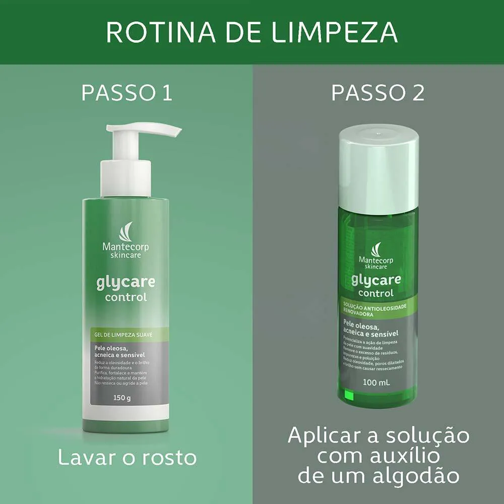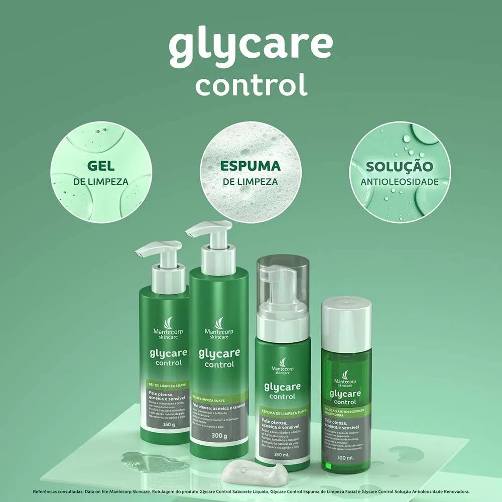 GLYCARE CONTROL GEL DE LIMPEZA promove uma limpeza suave e eficaz com ação antipoluição para as peles oleosas, acneicas e sensíveis, removendo os resíduos e impurezas da pele e reduzindo de forma duradoura o brilho e oleosidade da pele sem agredir ou ressecá-la.