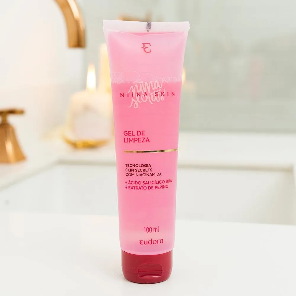 O gel de limpeza eudora niina skin possui a exclusiva tecnologia Skin Secrets, que é um blend de ativos dermatológicos de alta eficácia: o Pentilenoglicol da cana-de-açúcar com a Niacinamida, juntos, auxiliam a potencializar a hidratação e equilíbrio natural da barreira da pele.
