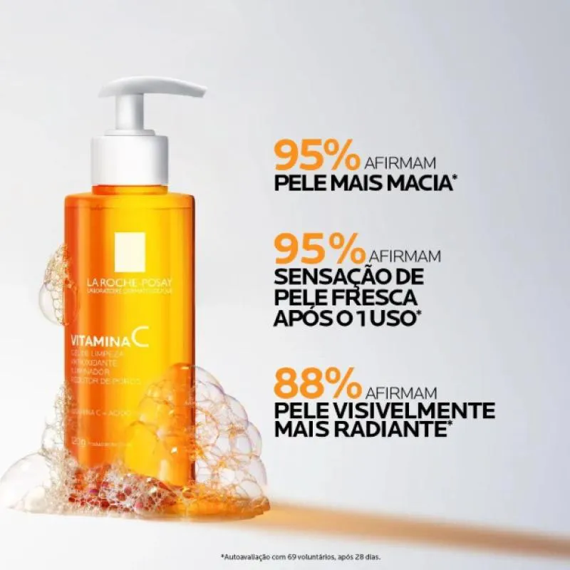 O Gel de Limpeza vitamina C La Roche-Posay é um dermocosmético de alta performance formulado para limpar profundamente e revitalizar a pele. Combinando Vitamina Cg (atuando como potente antioxidante e anti-idade) e Ácido Salicílico (promovendo renovação celular e controle da oleosidade), oferece resultados visíveis desde a primeira aplicação. 95% relatam pele mais macia* e sensação de frescor após o 1º uso. 88% notam pele mais radiante após 28 dias**. Antioxidante com Vitamina Cg que combate radicais livres. Ácido Salicílico que renova a pele e controla a oleosidade. Reduz visivelmente o tamanho dos poros e melhora luminosidade. Indicado para todos os tipos de pele, especialmente oleosas. *Autoavaliação com 69 voluntários após o primeiro uso. **Autoavaliação com 69 voluntários após 28 dias.