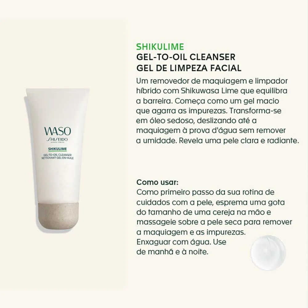 O SHIKULIME Gel-to-Oil Cleanser - GEL DE LIMPEZA FACIAL E DEMAQUILANTE é um híbrido de removedor de maquiagem e limpador com barreira balanceadora de Shikuwasa Lime (limão típico da região de Okinawa) que remove impurezas, excesso de sebo e maquiagem sem ressecar a pele. Começando como uma textura de gel macia, o limpador agarra as impurezas e, em seguida, se transforma em um óleo sedoso, removendo até mesmo a maquiagem à prova d'Água sem retirar a umidade para revelar uma pele clara e radiante que é fresca e revitalizada.