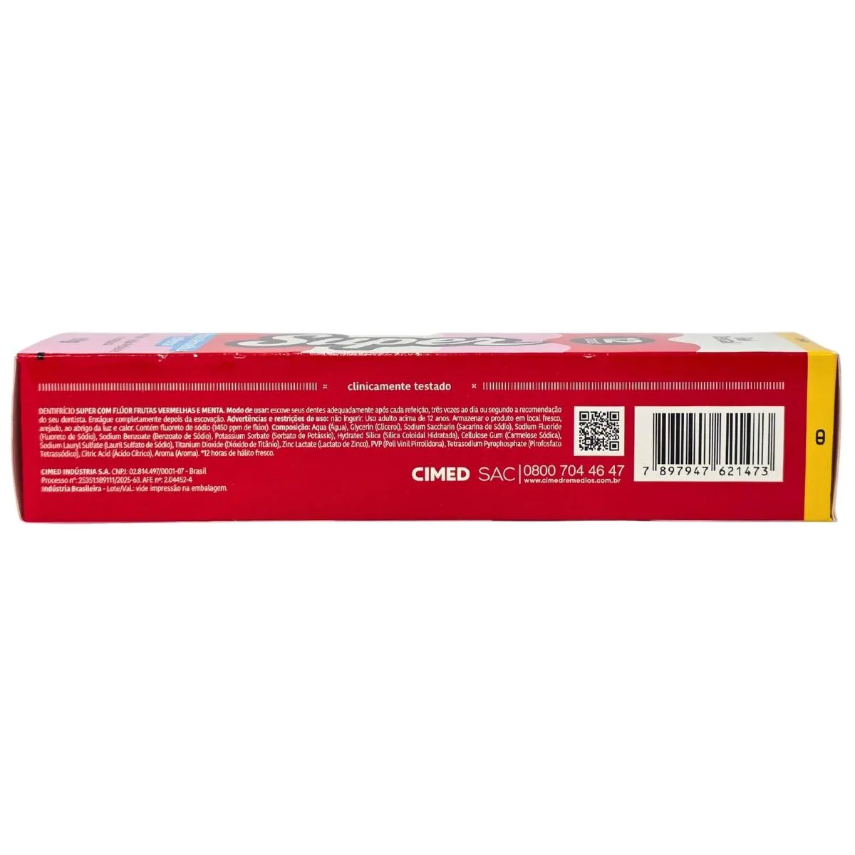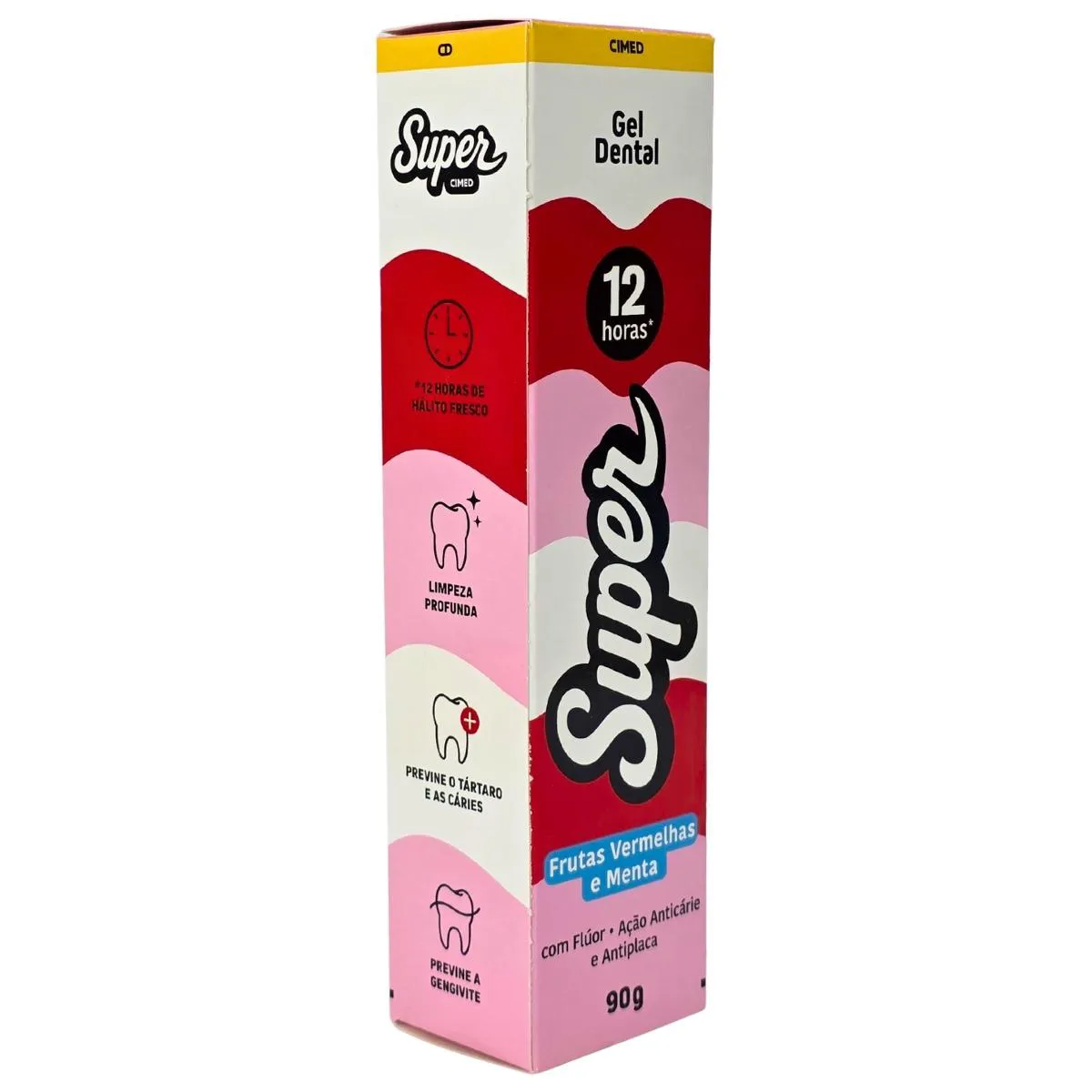 Finalidade: O Gel Dental Super 12 Horas Sabor Frutas Vermelhas e Menta é um gel dental ideal para auxiliar na higiene diária dos dentes, proporcionando até 12 horas de proteção. Sua fórmula possui flúor, oferecendo ação anticárie e anti placas, contribuindo para saúde bucal contínua e sensação prolongada de limpeza.
