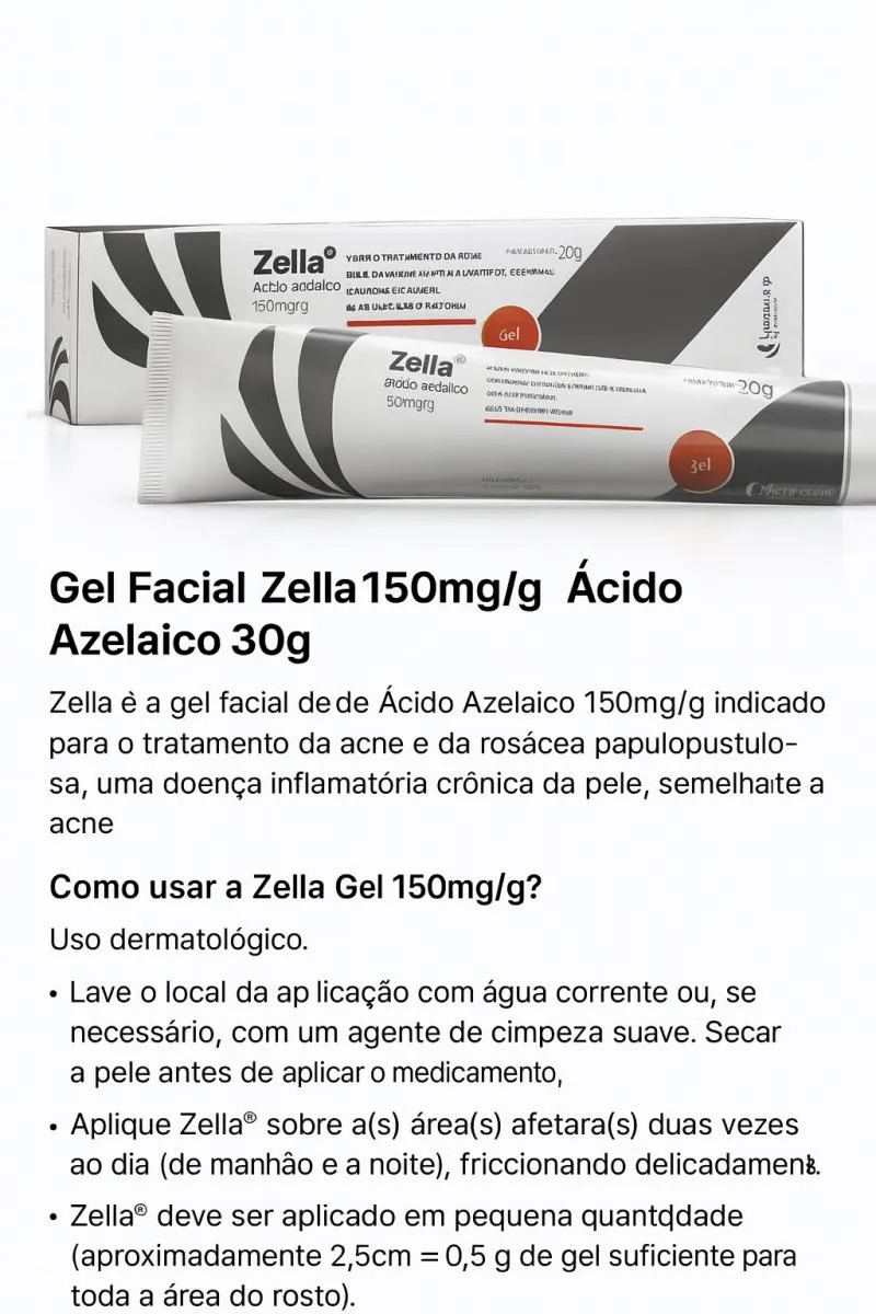 Gel Facial Zella 150 mg/g Ácido Azelaico 30 gZella é um gel facial de ácido azelaico 150 mg/g indicado para o tratamento da acne e da rosácea papulopustulosa, uma doença inflamatória crônica da pele semelhante à acne.