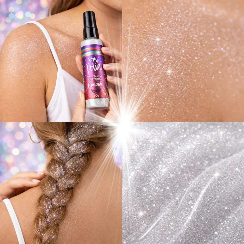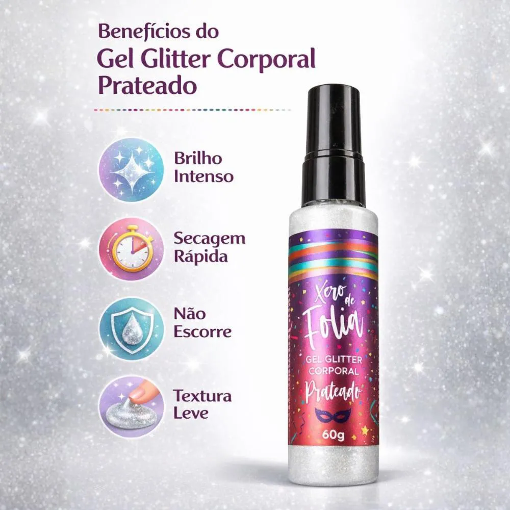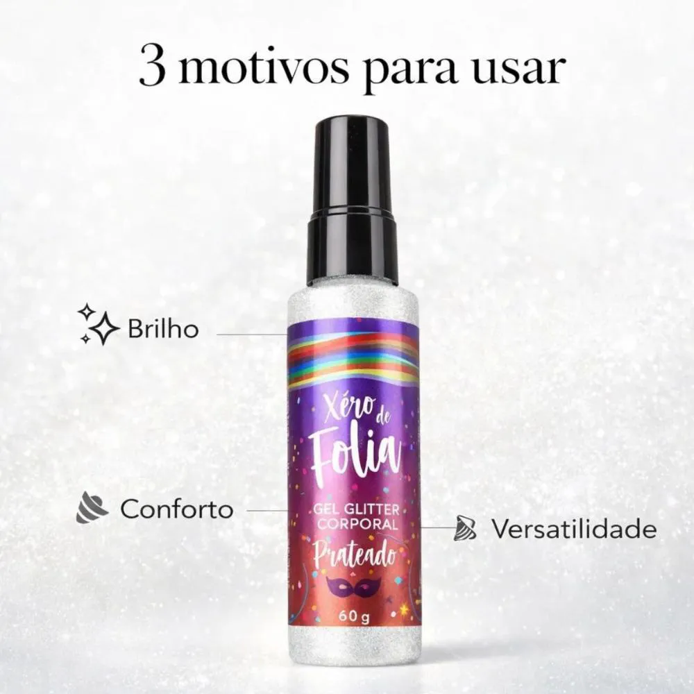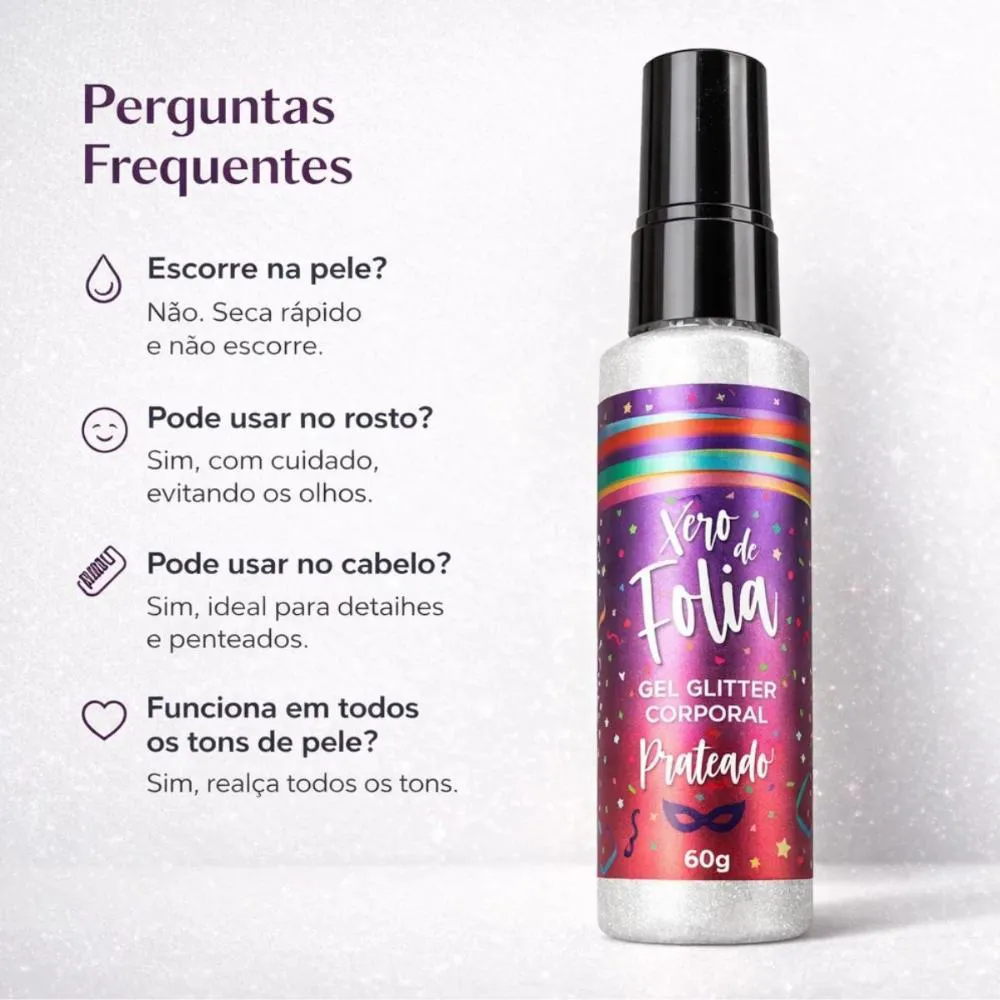 O Gel Glitter Corporal Xêro de Folia é um produto cosmético com glitter prateado, desenvolvido para adicionar brilho e efeito decorativo em diferentes partes do corpo. Serve para trazer brilho com conforto e praticidade no dia a dia e em festas, podendo ser aplicado no corpo, rosto (com cuidado) e cabelo, realçando todos os tons de pele e permitindo acabamentos criativos como detalhes em penteados e tranças.