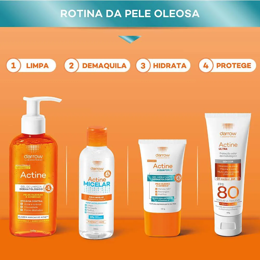 Darrow Actine Aquaforce Hidratante Dermatológico é um gel indicado para a hidratação de uso diário das peles oleosas a acneicas, que oferece hidratação por 48hrs, controla a oleosidade, matifica e reenergiza a pele.