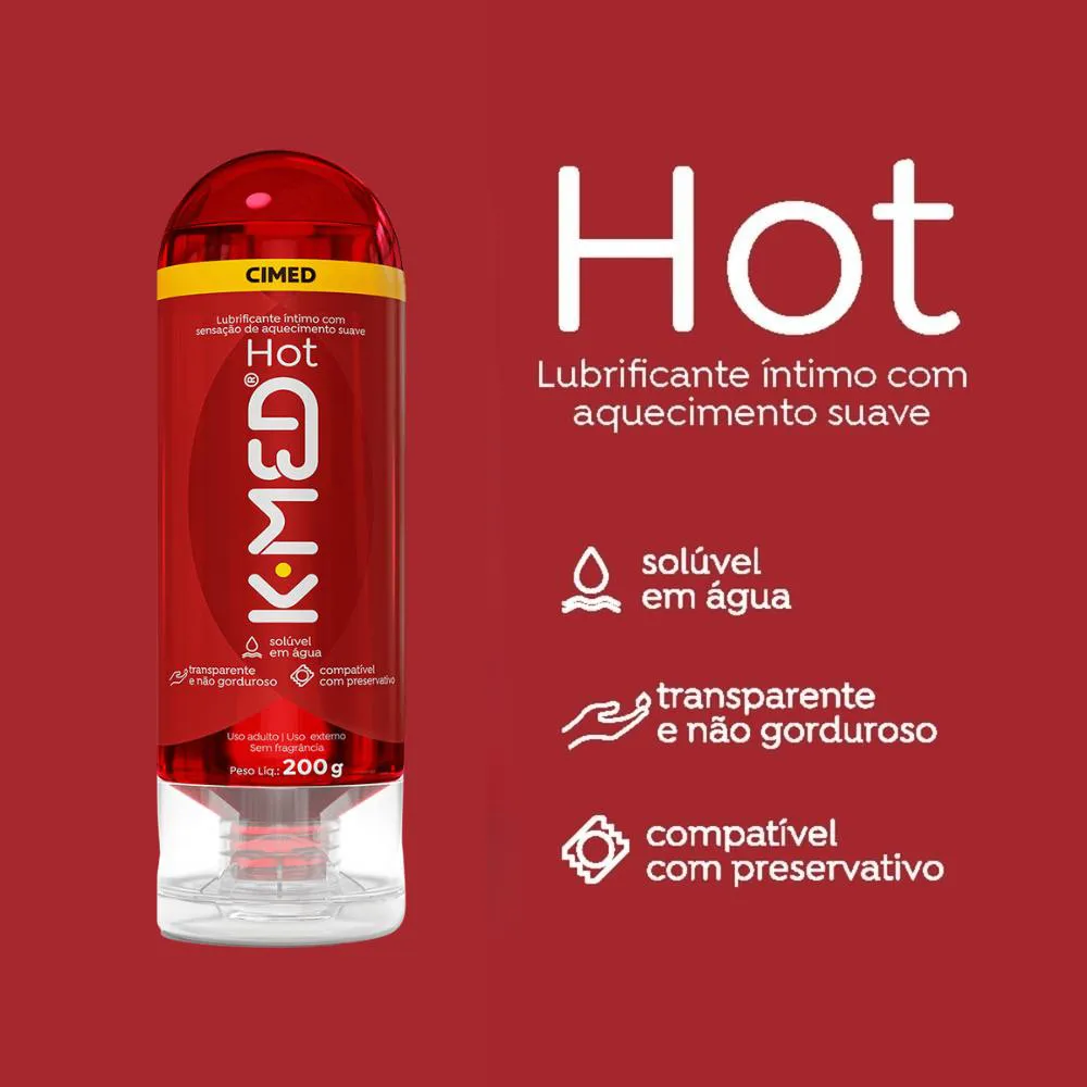K-Med Hot é um gel lubrificante íntimo que se assemelha à lubrificação natural do corpo, liberando uma agradável sensação de aquecimento. Em formato gel transparente, não gorduroso e sem fragrância, ele é um produto dermatologicamente e ginecologicamente testado que também pode ser usado com preservativo e está disponível em embalagem com 200g.