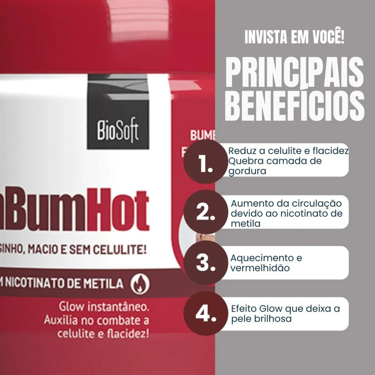 Fórmula Poderosa: Desenvolvida por especialistas em cuidados com a pele, possui fórmula única com nicotinato de metila que ajuda reduzir visivelmente a celulite em áreas como bumbum ou coxas.