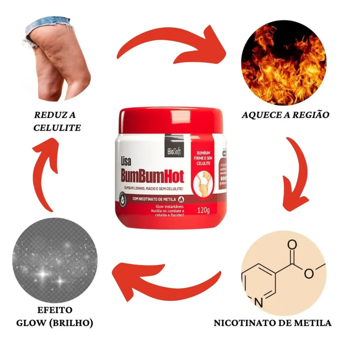 Sua ação é hiperemiante que causa um aquecimento e vermelhidão da região entre 20 a 30 minutos, devido à função do nicotinato de metila que aumenta a circulação do sangue. Isso tudo é o que promove e favorece a redução da celulite no local.