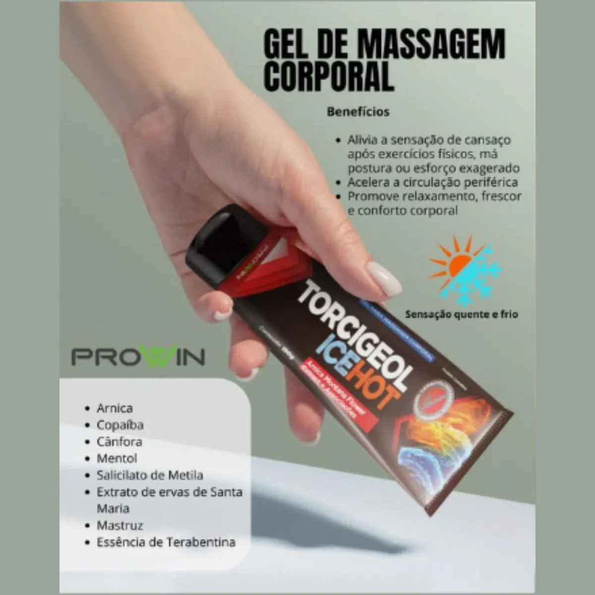O Gel de Massagem Torcigeol IceHot Prowin foi desenvolvido para proporcionar alívio e bem-estar por meio da sensação refrescante e aquecedora. Enriquecido com Arnica Montana, auxilia na recuperação após esforços físicos, massagens relaxantes e no cuidado diário da musculatura. Sua fórmula é de fácil absorção e não deixa a pele oleosa.