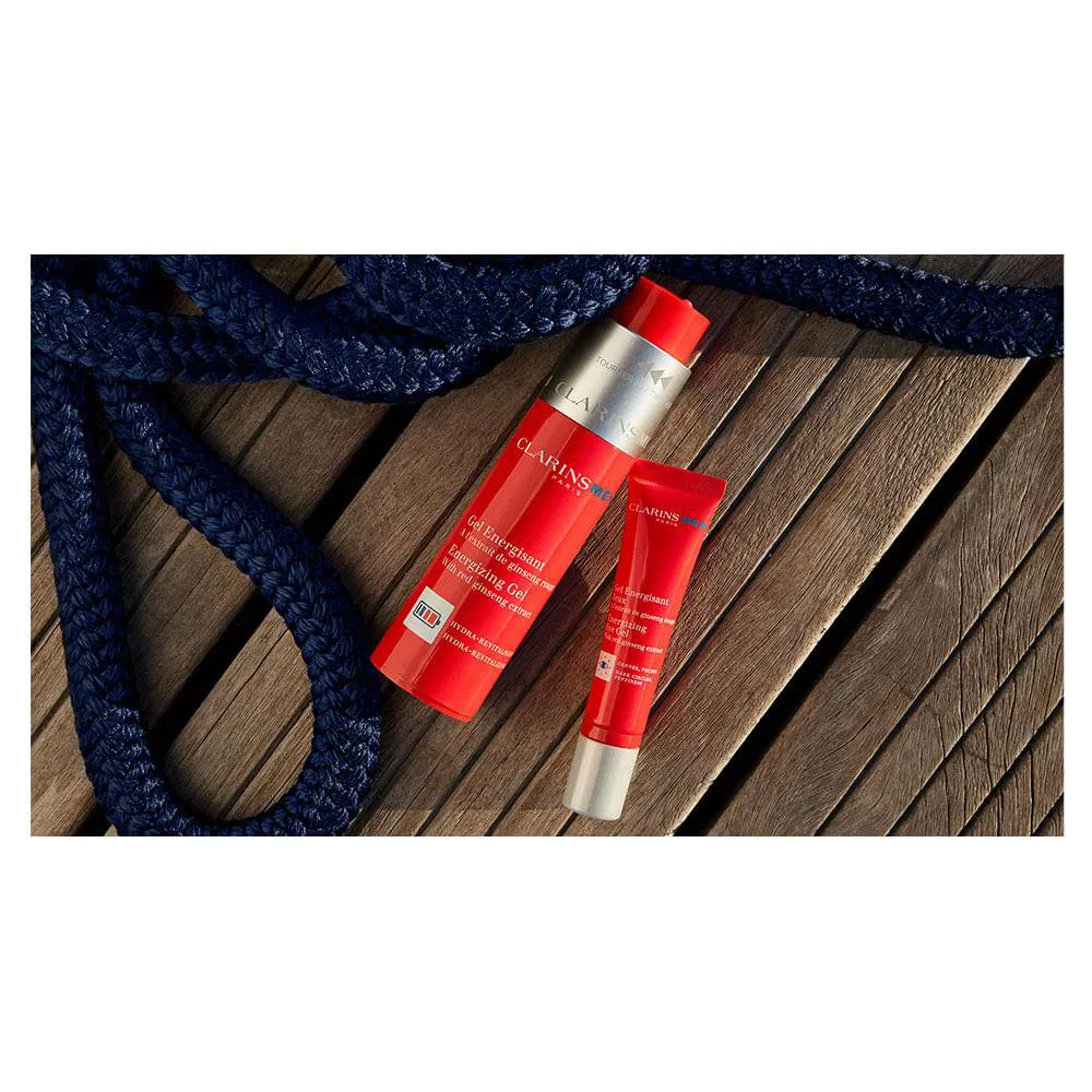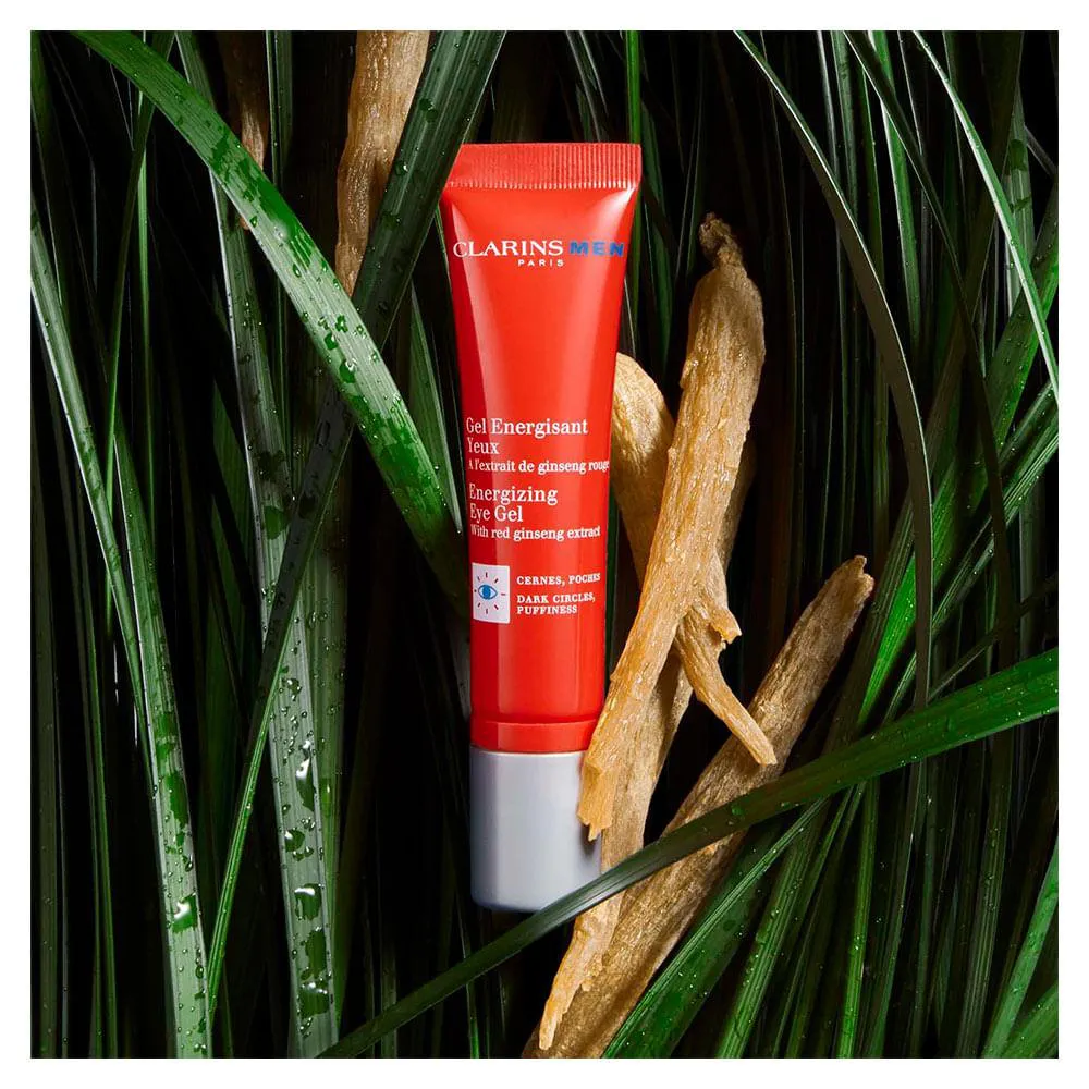 Com extrato de ginseng vermelho orgânico e Inovação ClarinsMen: o [G-RED COMPLEX]: o extrato de ginseng é associado aos extratos de erva-doce (também orgânicos) e de gymnema para energizar e estimular a pele.