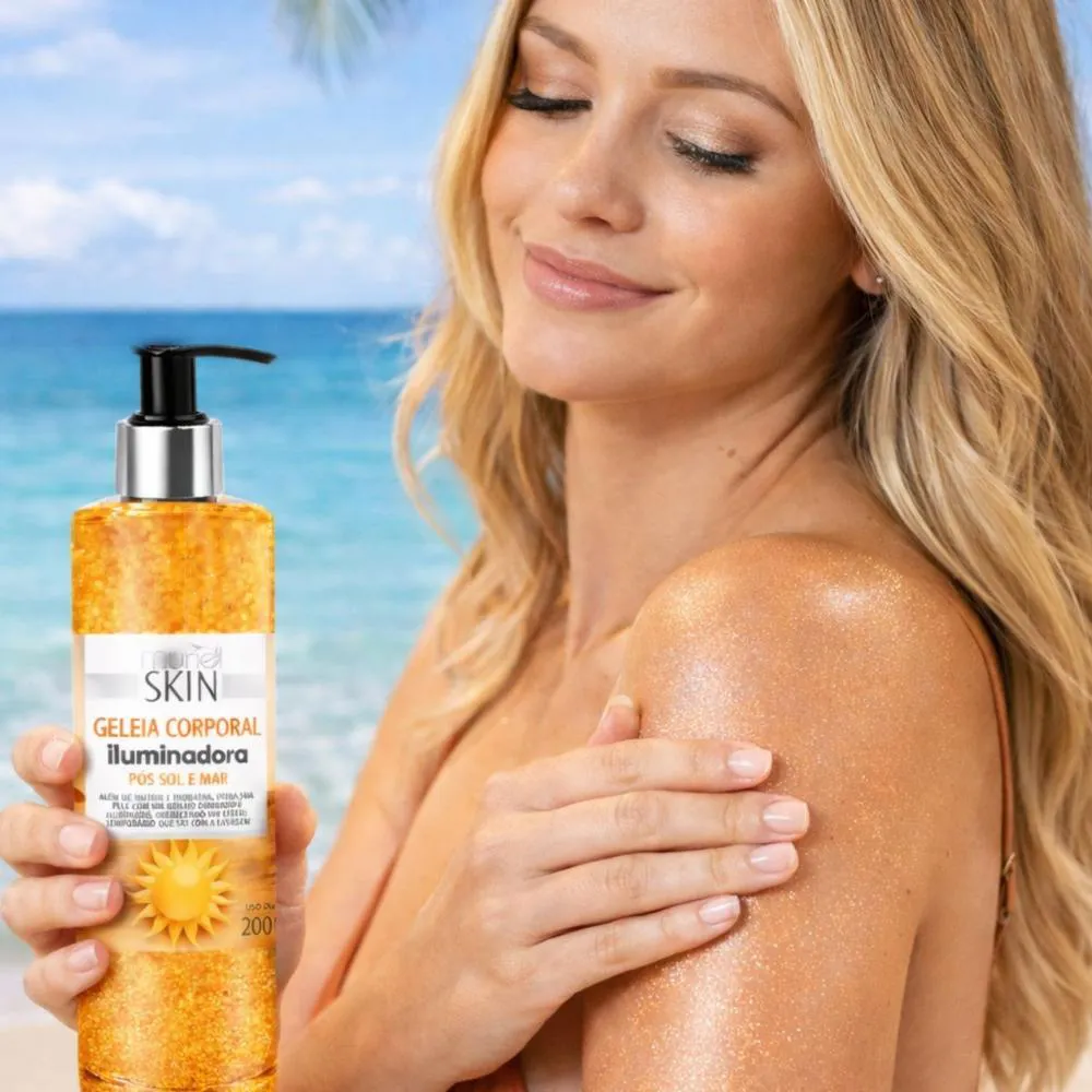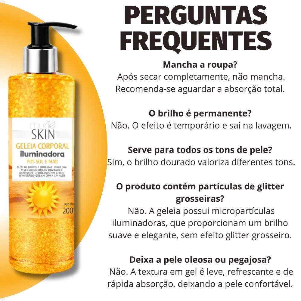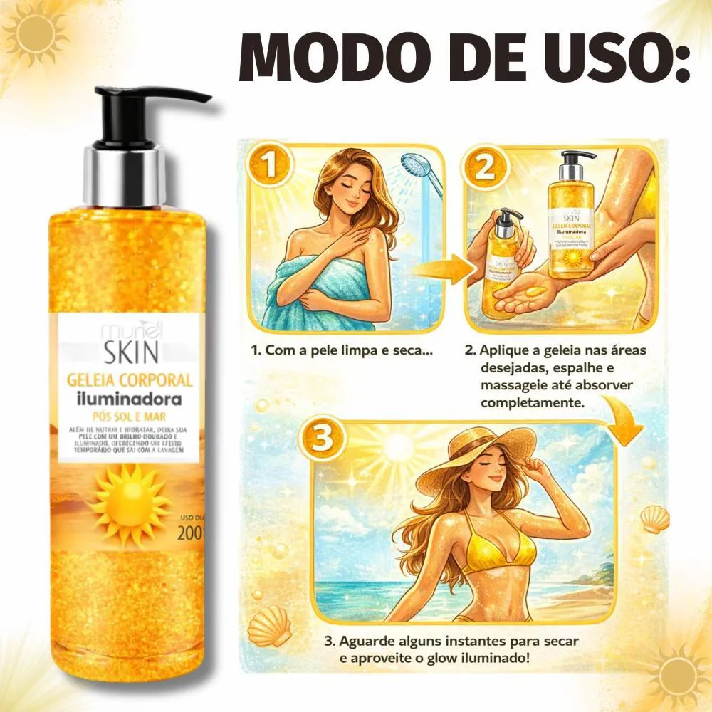 Desenvolvida especialmente para realçar a sua pele após o contato com o sol e o mar, a Geleia Corporal Iluminadora Muriel Skin Pós Sol e Mar 200ml vai muito além da nutrição e hidratação! Com uma fórmula inovadora, ela proporciona um brilho dourado e iluminado, deixando a sua pele radiante e com um toque irresistível de luminosidade. Ideal para dar aquele efeito glow temporário e perfeito para qualquer ocasião, o brilho é facilmente removido com a lavagem, permitindo que você escolha quando brilhar. Experimente a Geleia Corporal Iluminadora e sinta a diferença de uma pele nutrida, hidratada e cheia de vida!Dê à sua pele o cuidado que ela merece com a Geleia Muriel Corporal Iluminadora Skin Pós Sol e Mar! Especialmente desenvolvida para a pele exposta ao sol e ao mar, a Geleia Muriel Corporal Iluminadora é a solução perfeita para hidratar, iluminar e recuperar a vitalidade da sua pele. Sua fórmula única proporciona um efeito iluminado instantâneo e promove uma sensação de frescor e maciez, ideal para manter a pele saudável após a exposição ao sol ou ao mar.Benefícios Principais