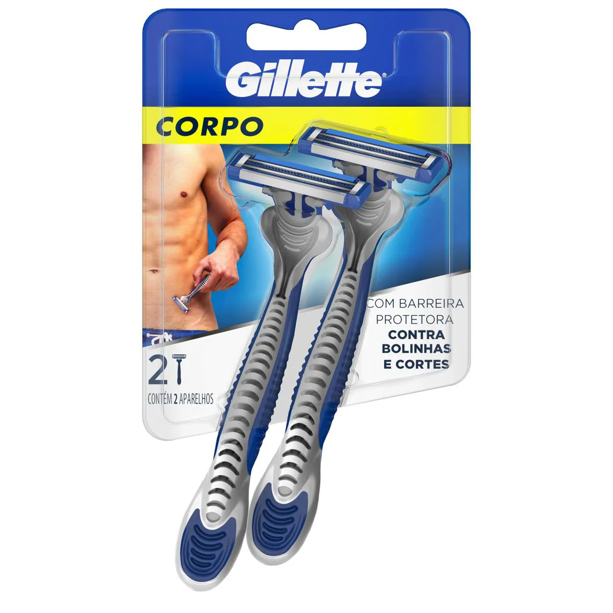 O aparelho descartável Gillette Corpo foi desenvolvido com fita Lubrastrip com vitamina e Aloe Vera para um melhor deslizar, causando menos irritação e 3x mais lubrificação. Ele é equipado com um cabo ergonômico para melhor aderência, 3 lâminas montadas sobre molas independentes e também pode ser usado para raspar qualquer parte do corpo.