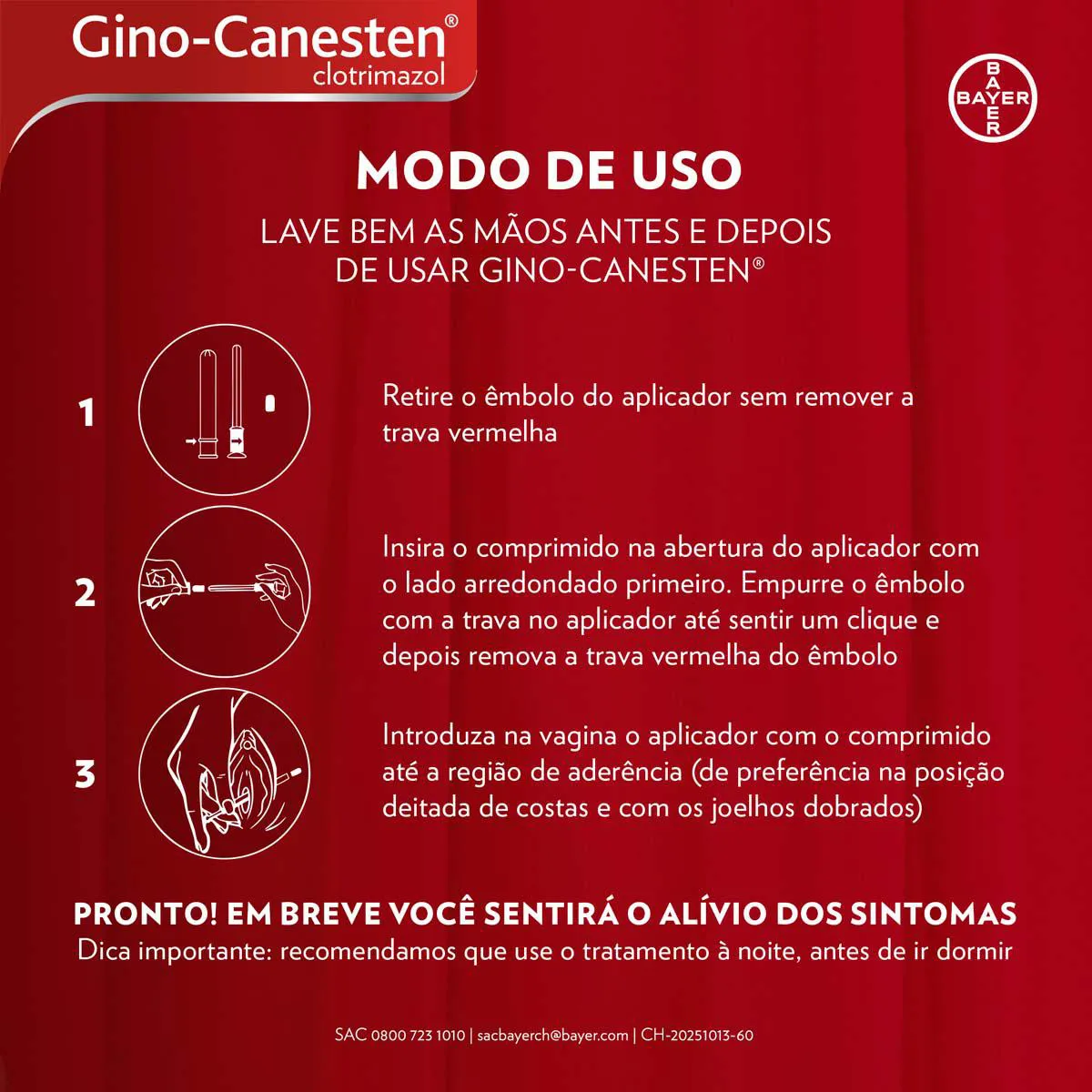 Utilize Gino-Canesten® 1 comprimido vaginal conforme instruções de aplicação abaixo. Fale com o seu médico ou farmacêutico se tiver dúvidas.