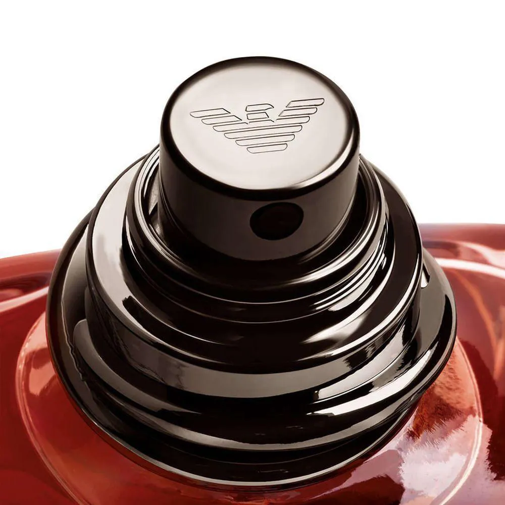 Design ou Pde: O frasco de 100ml, com laca âmbar graduada e tampa prateada com anéis entrelaçados, simboliza união. A embalagem utiliza papelão certificado pelo FSC, reforçando o compromisso da Armani com a sustentabilidade. O tamanho é adequado para uso regular ou como presente.