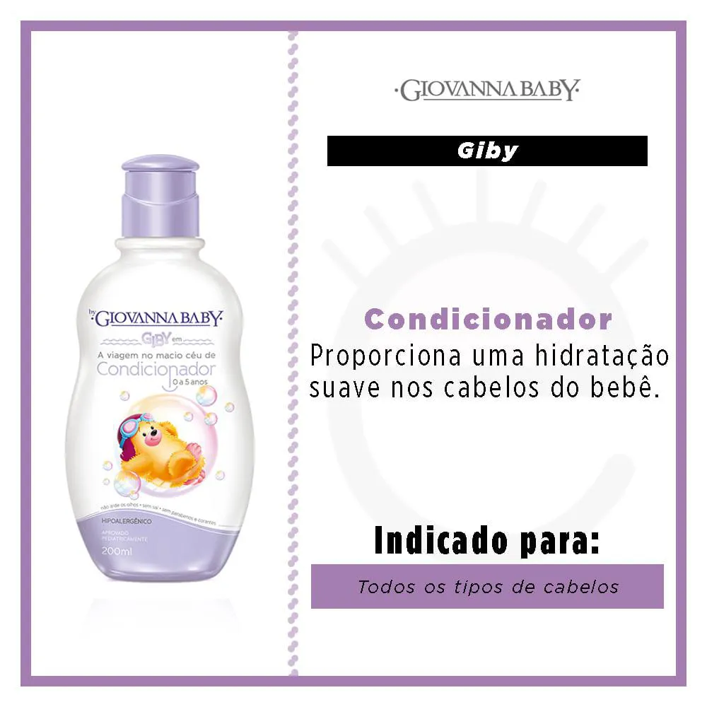 O condicionador Suave Giby de Giovanna Baby, foi especialmente desenvolvido para o delicado couro cabeludo do seu bebê. Possui o exclusivo ativo “Giby Care”: Uma fórmula cuidadosamente enriquecida com extrato de coco, que promove hidratação natural; extrato de algodão, com propriedades emolientes, e “mel vegetal”, com propriedades nutritivas.