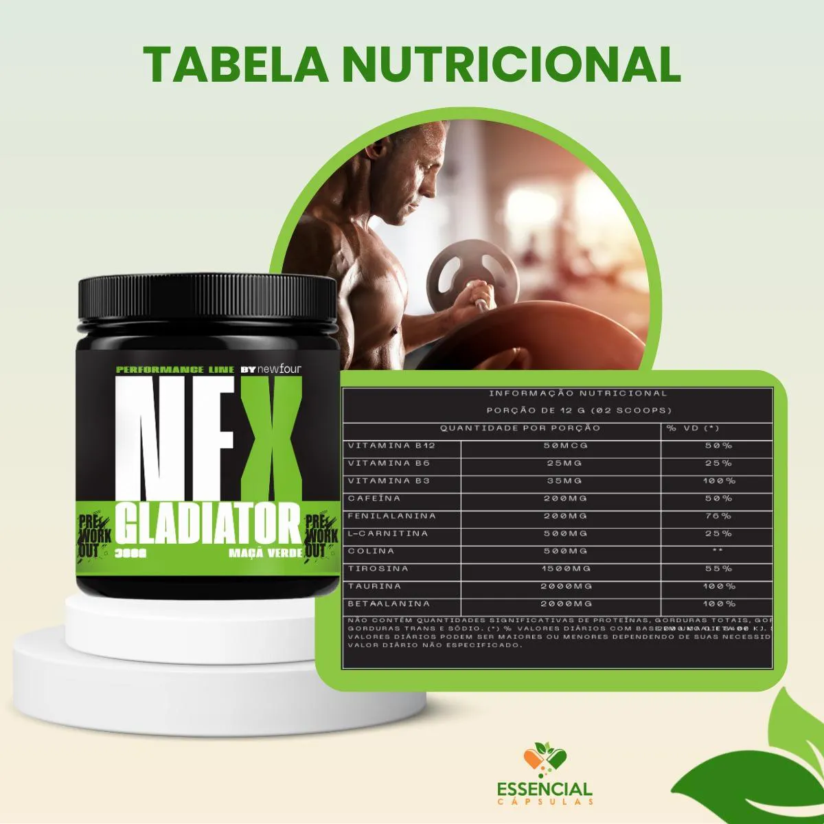 BEM VINDO(A) À ESSENCIAL CÁPSULAS Aqui, acreditamos que cuidar da saúde pode (e deve) ser algo natural, leve e diário. PRODUTO: - Gladiator sabor maça verde MARCA: - NEW FOUR BENEFÍCIOS: ● Ideal para rotinas que pedem mais força, concentração e ritmo ● Combinação de vitaminas do complexo B SUGESTÃO DE CONSUMO (PELO FABRICANTE): - 12g (dois scoops), 30 minutos antes das atividades físicas - Diluir em 200ml de água IMPORTANTE SABER: - Este produto é um suplemento alimentar natural. - Não é medicamento e não substitui uma alimentação equilibrada nem o acompanhamento de um profissional da saúde. - Como um produto natural, seus benefícios podem ser vistos a partir de alguns dias do uso. - Os suplementos são destinados a pessoas saudáveis. Sua finalidade é fornecer nutrientes, substâncias bioativas, enzimas ou probióticos em complemento à alimentação. COMPOSIÇÃO: - vitamina B12 (cianocobalamina), Vitamina B6 (piridoxina HCL), Vitamina B3 (nicotinamida), Cafeína, Fenilalanina, L-carnitina (colina), Bitartarato de cólica, Tirosina, Taurina, Beta-alanina, antiumectante (dióxido de silício), edulcorante (sucralose), acidificante (ácido cítrico), aroma idêntico ao natural de maça verde e excipiente (maltodextrina). NÃO CONTÉM GLÚTEN CONTRAINDICAÇÃO: - O uso não é recomendado para gestantes, lactantes e crianças. - Em caso de uso contínuo de medicamentos ou condições específicas de saúde, busque a orientação de um profissional da saúde. QUALIDADE: - Sabemos que o mercado de suplementos é competitivo, com opções para todos os públicos e faixas de preço. Na nossa loja, priorizamos a qualidade em cada detalhe. Por isso, escolhemos trabalhar apenas com fábricas que utilizam matérias-primas de excelência e seguem rigorosos padrões de produção. ENVIAMOS RAPIDINHO: - Seu pedido é preparado com todo cuidado e postado em até 24 horas úteis após a confirmação da compra. (Na maioria das vezes, enviamos bem antes disso)! FALE CONOSCO: Tem dúvidas ou quer conversar sobre o produto? Nosso atendimento é humanizado e está sempre pronto para te ouvir com muita atenção!