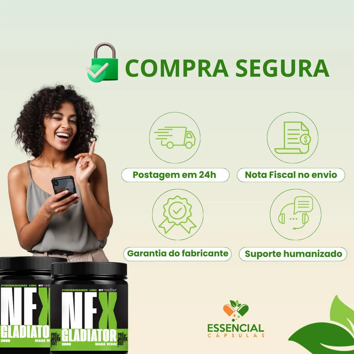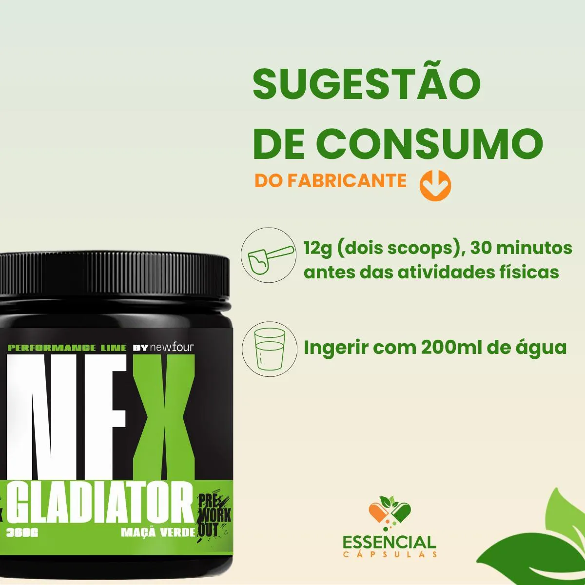 BEM VINDO(A) À ESSENCIAL CÁPSULAS Aqui, acreditamos que cuidar da saúde pode (e deve) ser algo natural, leve e diário. PRODUTO: - Gladiator sabor maça verde MARCA: - NEW FOUR BENEFÍCIOS: ● Ideal para rotinas que pedem mais força, concentração e ritmo ● Combinação de vitaminas do complexo B SUGESTÃO DE CONSUMO (PELO FABRICANTE): - 12g (dois scoops), 30 minutos antes das atividades físicas - Diluir em 200ml de água IMPORTANTE SABER: - Este produto é um suplemento alimentar natural. - Não é medicamento e não substitui uma alimentação equilibrada nem o acompanhamento de um profissional da saúde. - Como um produto natural, seus benefícios podem ser vistos a partir de alguns dias do uso. - Os suplementos são destinados a pessoas saudáveis. Sua finalidade é fornecer nutrientes, substâncias bioativas, enzimas ou probióticos em complemento à alimentação. COMPOSIÇÃO: - vitamina B12 (cianocobalamina), Vitamina B6 (piridoxina HCL), Vitamina B3 (nicotinamida), Cafeína, Fenilalanina, L-carnitina (colina), Bitartarato de cólica, Tirosina, Taurina, Beta-alanina, antiumectante (dióxido de silício), edulcorante (sucralose), acidificante (ácido cítrico), aroma idêntico ao natural de maça verde e excipiente (maltodextrina). NÃO CONTÉM GLÚTEN CONTRAINDICAÇÃO: - O uso não é recomendado para gestantes, lactantes e crianças. - Em caso de uso contínuo de medicamentos ou condições específicas de saúde, busque a orientação de um profissional da saúde. QUALIDADE: - Sabemos que o mercado de suplementos é competitivo, com opções para todos os públicos e faixas de preço. Na nossa loja, priorizamos a qualidade em cada detalhe. Por isso, escolhemos trabalhar apenas com fábricas que utilizam matérias-primas de excelência e seguem rigorosos padrões de produção. ENVIAMOS RAPIDINHO: - Seu pedido é preparado com todo cuidado e postado em até 24 horas úteis após a confirmação da compra. (Na maioria das vezes, enviamos bem antes disso)! FALE CONOSCO: Tem dúvidas ou quer conversar sobre o produto? Nosso atendimento é humanizado e está sempre pronto para te ouvir com muita atenção!
