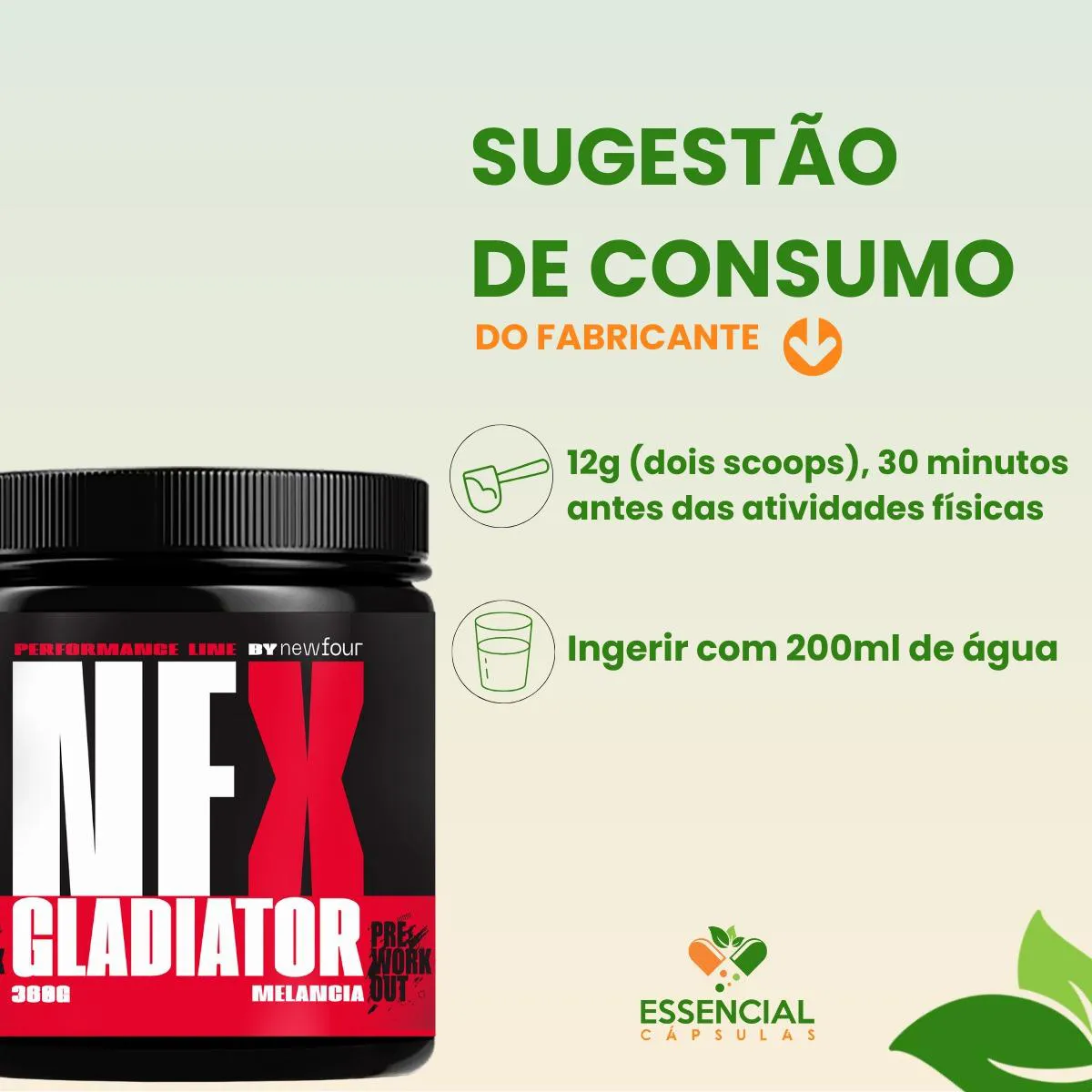 BEM VINDO(A) À ESSENCIAL CÁPSULAS Aqui, acreditamos que cuidar da saúde pode (e deve) ser algo natural, leve e diário. PRODUTO: - Gladiator sabor melância MARCA: - NEW FOUR BENEFÍCIOS: ● Ideal para rotinas que pedem mais força, concentração e ritmo ● Combinação de vitaminas do complexo B SUGESTÃO DE CONSUMO (PELO FABRICANTE): - 12g (dois scoops), 30 minutos antes das atividades físicas - Diluir em 200ml de água IMPORTANTE SABER: - Este produto é um suplemento alimentar natural. - Não é medicamento e não substitui uma alimentação equilibrada nem o acompanhamento de um profissional da saúde. - Como um produto natural, seus benefícios podem ser vistos a partir de alguns dias do uso. - Os suplementos são destinados a pessoas saudáveis. Sua finalidade é fornecer nutrientes, substâncias bioativas, enzimas ou probióticos em complemento à alimentação. COMPOSIÇÃO: - vitamina B12 (cianocobalamina), Vitamina B6 (piridoxina HCL), Vitamina B3 (nicotinamida), Cafeína, Fenilalanina, L-carnitina (colina), Bitartarato de cólica, Tirosina, Taurina, Beta-alanina, antiumectante (dióxido de silício), edulcorante (sucralose), acidificante (ácido cítrico), aroma idêntico ao natural de melância e excipiente (maltodextrina). NÃO CONTÉM GLÚTEN CONTRAINDICAÇÃO: - O uso não é recomendado para gestantes, lactantes e crianças. - Em caso de uso contínuo de medicamentos ou condições específicas de saúde, busque a orientação de um profissional da saúde. QUALIDADE: - Sabemos que o mercado de suplementos é competitivo, com opções para todos os públicos e faixas de preço. Na nossa loja, priorizamos a qualidade em cada detalhe. Por isso, escolhemos trabalhar apenas com fábricas que utilizam matérias-primas de excelência e seguem rigorosos padrões de produção. ENVIAMOS RAPIDINHO: - Seu pedido é preparado com todo cuidado e postado em até 24 horas úteis após a confirmação da compra. (Na maioria das vezes, enviamos bem antes disso)! FALE CONOSCO: Tem dúvidas ou quer conversar sobre o produto? Nosso atendimento é humanizado e está sempre pronto para te ouvir com muita atenção!